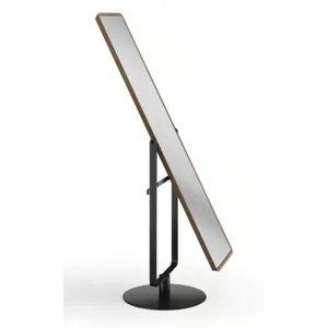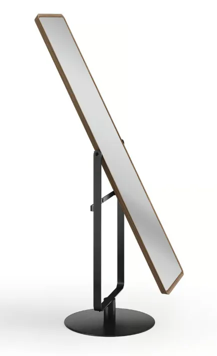 The mirror gracefully floats within the substantial beveled wood frame, which can tilt up or down effortlessly on its axis point and spin a full 360° on its sturdy weighted base.