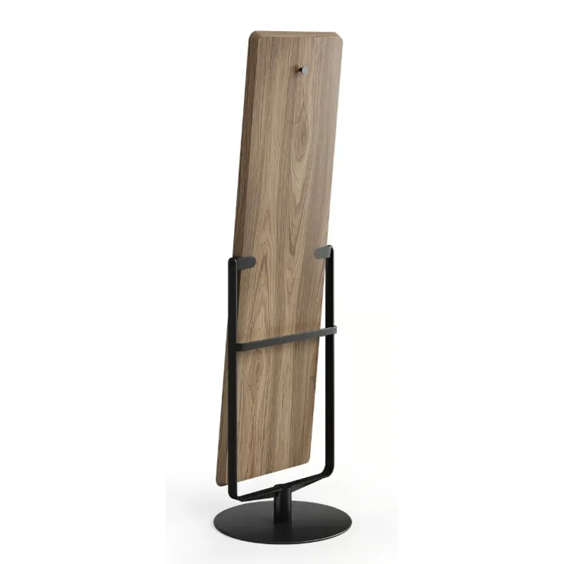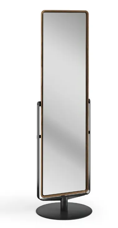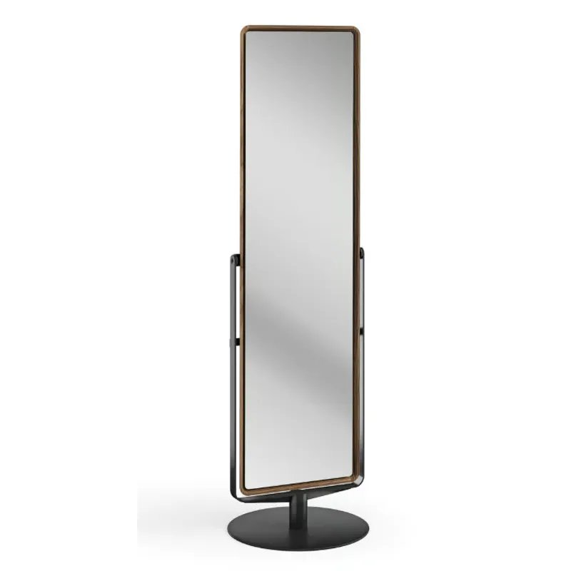 Rotating on its swivel base, Continuum features a full-length mirror floating within a solid wood beveled perimeter.