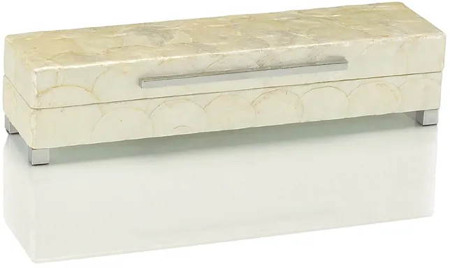 3.75"Hx4.25"Wx16"D. A lacquered white Capiz shell box with nickel feet shown in the shorter size.