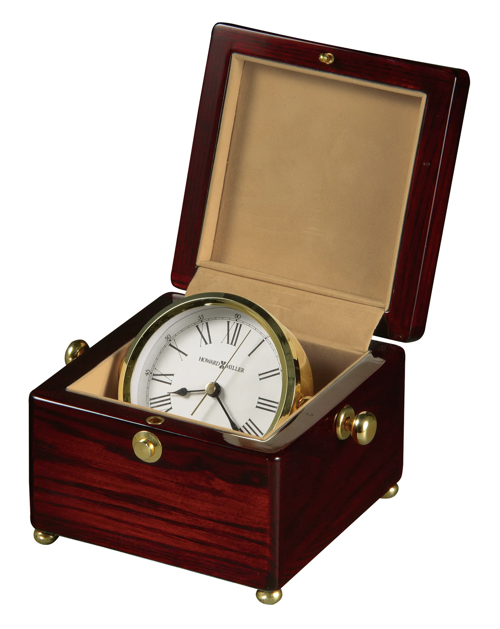 - Impart traditional beauty to your home with the Bailey wooden table clock from Howard Miller. It’s enclosed in a rosewood-finished box that coordinates beautifully with almost any interior design style. Classic Wood Finish: This timepiece has a high-gloss Rosewood Hall finish, which is applied over select hardwoods and veneers for durability and an elegant look. This table clock is a good size for a side table or desk. Refined Details: The brass-finish feet, push-button catch, and angle adjustment knobs serve as functional accents for this table clock, which has a gimbaled white dial that tilts for precise positioning. The black hands and numerals stand out against the dial, which is encased in protective glass crystal. Great as a Gift: Present this timepiece to the newlywed couple or give it as an anniversary gift. It also makes a good gift for housewarming celebrations and holidays. Quartz Movement: This wooden table clock has a battery-operated quartz movement. Howard Miller: Founded in 1926 and still family-owned in its third generation, Howard Miller is the world’s leading clock company and a respected brand name in fine specialty furnishings such as curio cabinets, wine & bar furnishings, custom storage cabinets, and SmartMoves® adjustable height desks.