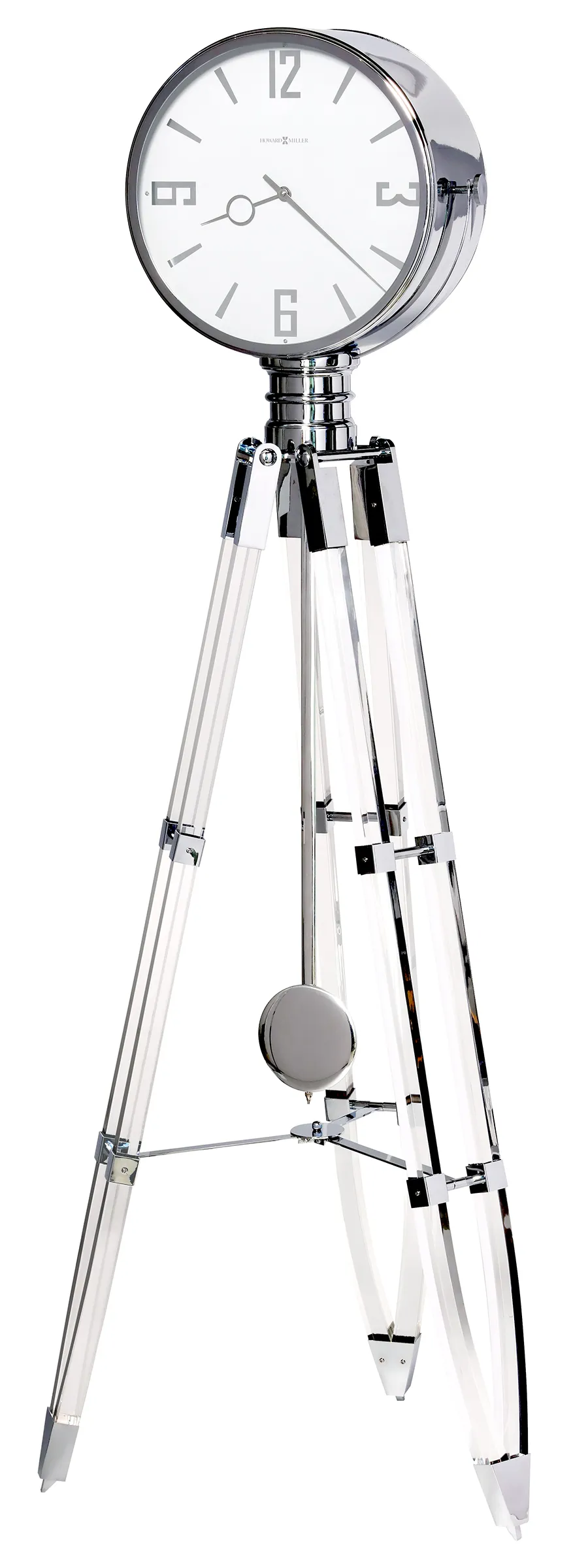 - Howard Miller delivers stunning design with this polished chrome tripod grandfather clock. With a polished appearance and unique style, this clock is an ideal decorative piece for any home or office. Tripod Design: The tripod and bezel design of this Howard Miller exclusive were inspired by retro Hollywood movie lights and feature clear acrylic legs with polished chrome-finished metal accents. The end result is a truly unique and memorable piece. Unique Face: Beautifully designed, this clock features a stationary white dial with chrome-finished Arabic numerals, hour markers, and hands, all surrounded by a wide, polished chrome-finished bezel. Paired with the unique face is a polished chrome-finished pendulum bob suspended on a polished chrome-finished metal stick. Polished Chrome: With highly polished and reflective metal finishes, natural blemishes are normal and add to the unique flair of this stunning tripod grandfather clock. Quartz Movement: Quartz, triple-chime Harmonic movement plays your choice of full Westminster or Ave Maria chimes with strike on the hour with 1/4, 1/2, and 3/4 chimes accordingly. Additionally, this clock features volume control and an automatic nighttime chime shut-off option and requires two C sized and two D sized batteries. Howard Miller: Founded in 1926 and still family-owned in its third generation, Howard Miller is the world’s leading clock company and a respected brand name in fine specialty furnishings such as curio cabinets, wine & bar furnishings, custom storage cabinets, and SmartMoves® adjustable height desks.