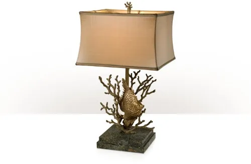 A finely cast brass table lamp, the base of a tropical fish swimming in coral, on a stepped marble plinth base, surmounted by a hand sewn silk shade and a brass coral finial.