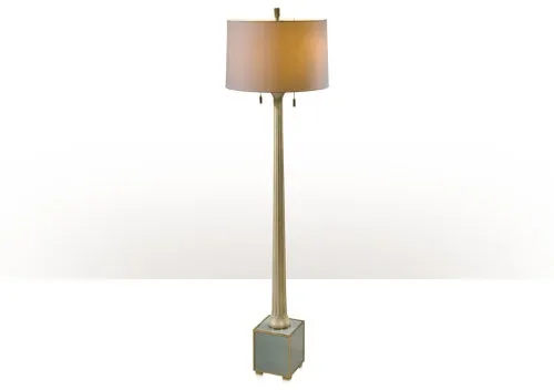 A silver leafed wood and powder blue painted standard lamp, the fluted tapering column on a powder blue painted panelled cube base with brass accents, surmounted by a hand sewn shade and a brass cylinder finial.