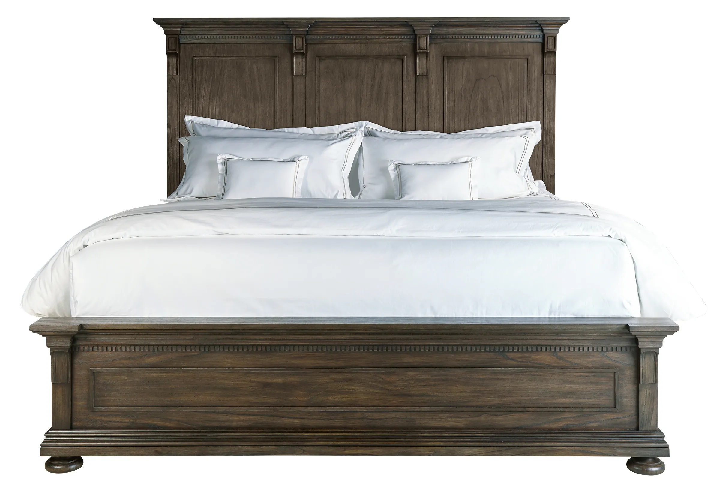 - Break front headboard top with flat posts and corbels and three overlay molded panels.