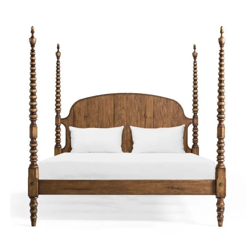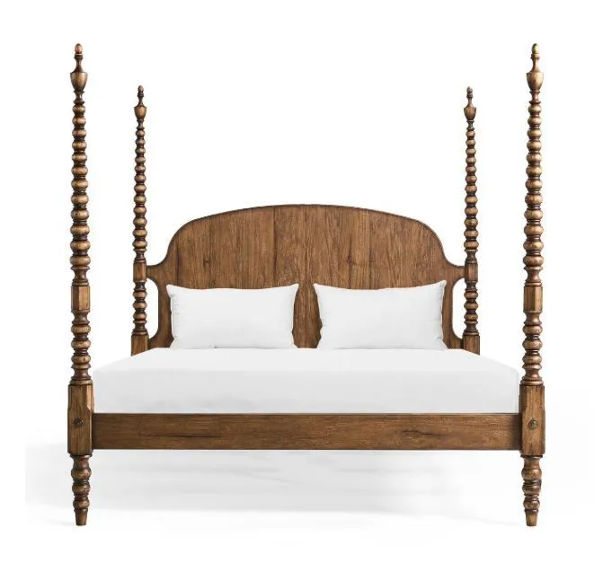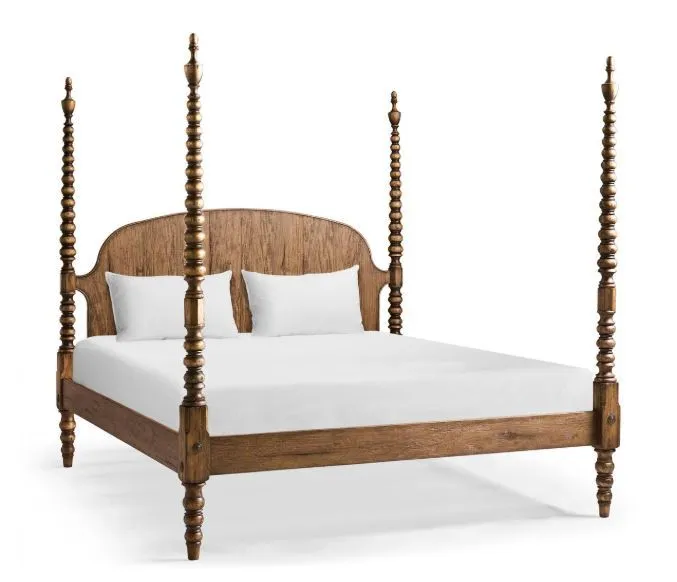 A timeless silhouette reimagined with bold materiality, the Tamarisk King Bed evokes heritage craftsmanship and quiet grandeur. Crafted from solid acacia wood and finished in our richly toned Medium Spain Walnut, this bed features intricately turned posts and a gently arched, panelled headboard that adds warmth and depth to the form. The natural character of the acacia wood is enhanced by the finish, bringing out the unique grain patterns and organic beauty inherent in each piece. Stately yet approachable, the Tamarisk Bed makes a commanding statement in the room while remaining refined and versatile.