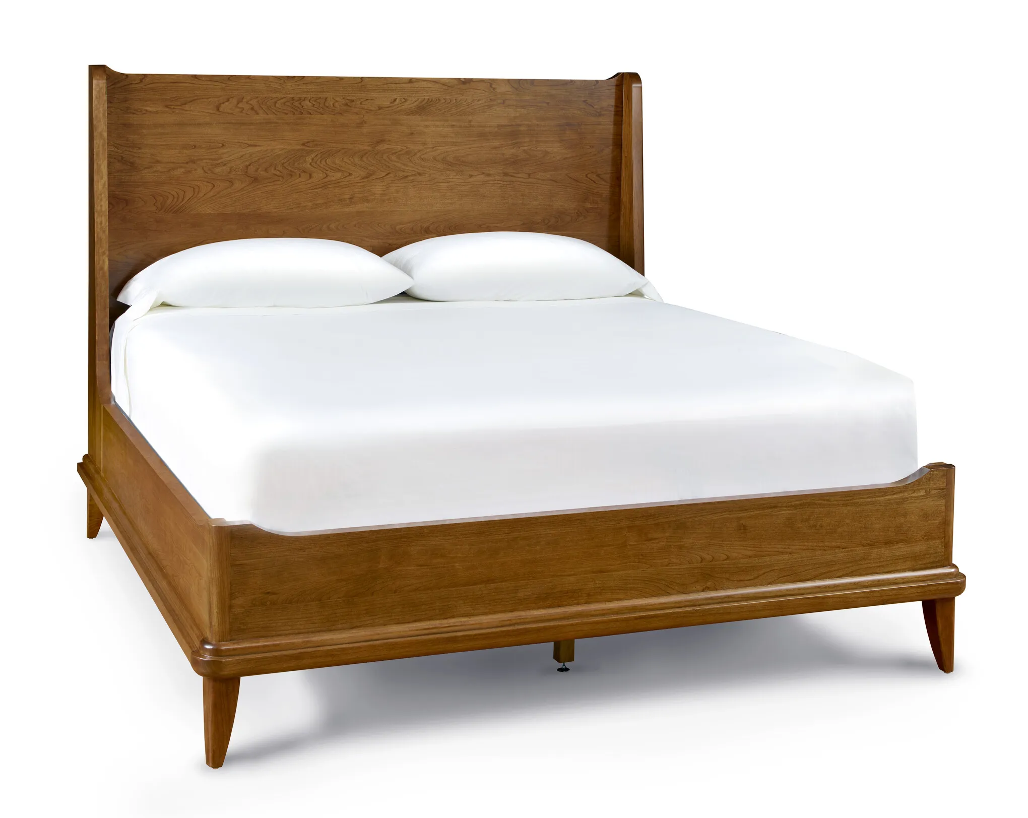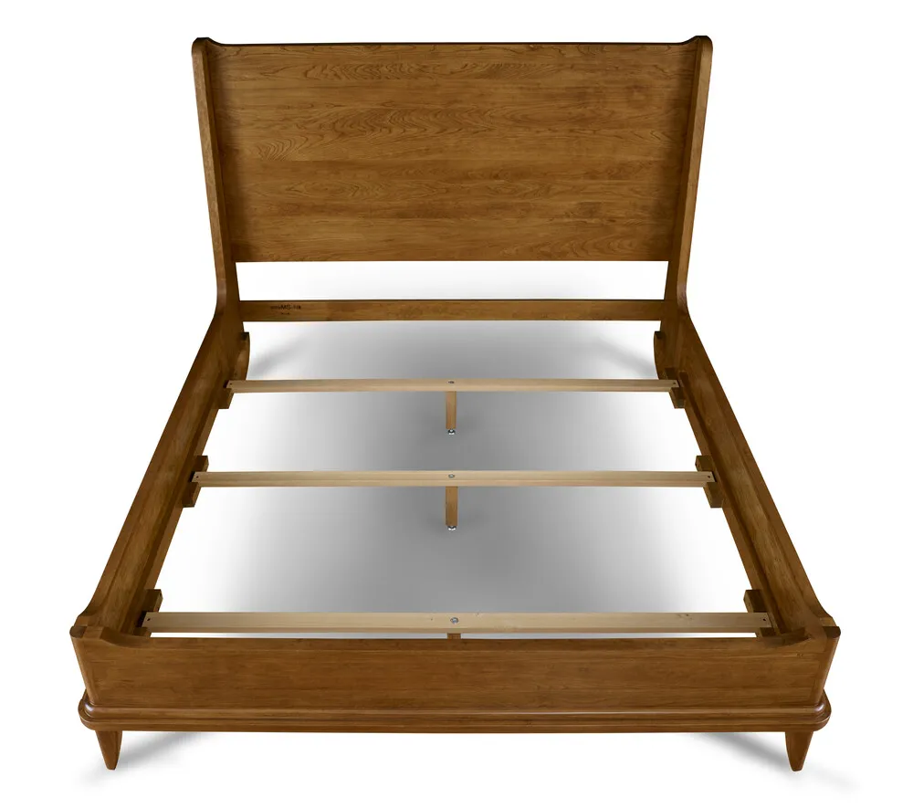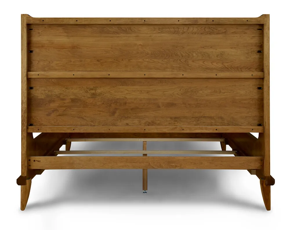 Creating a subtle sense of enclosure, the solid-cherry Martine Bed's shelter-style fins flow down to join low rails whose ends sweep slightly upward. Bold but softly rounded moldings follow the lines of the base, and the legs are also smoothly radiused. The finished look is clean yet warm and inviting, with a hint of mid-century style.