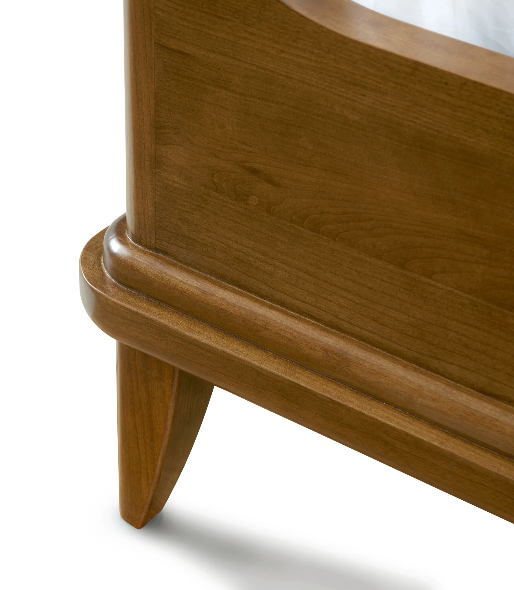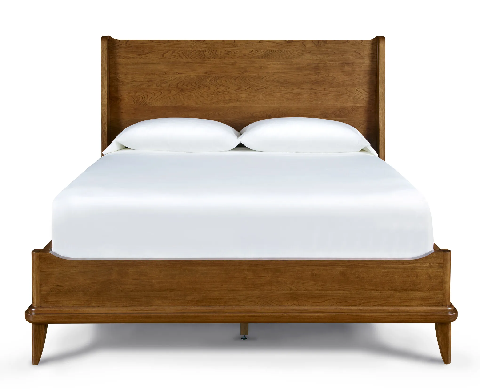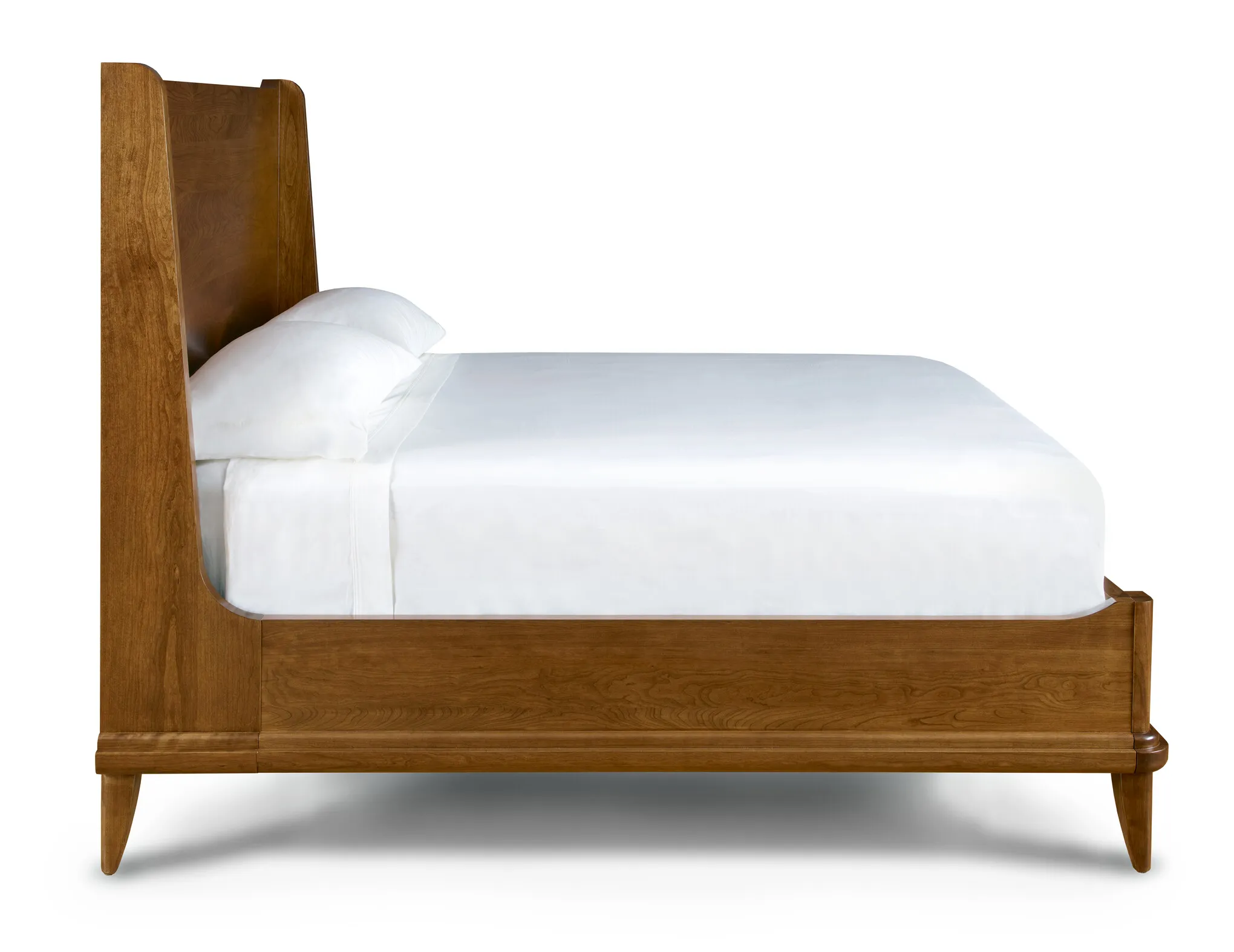 Creating a subtle sense of enclosure, the solid-cherry Martine Bed's shelter-style fins flow down to join low rails whose ends sweep slightly upward. Bold but softly rounded moldings follow the lines of the base, and the legs are also smoothly radiused. The finished look is clean yet warm and inviting, with a hint of mid-century style.