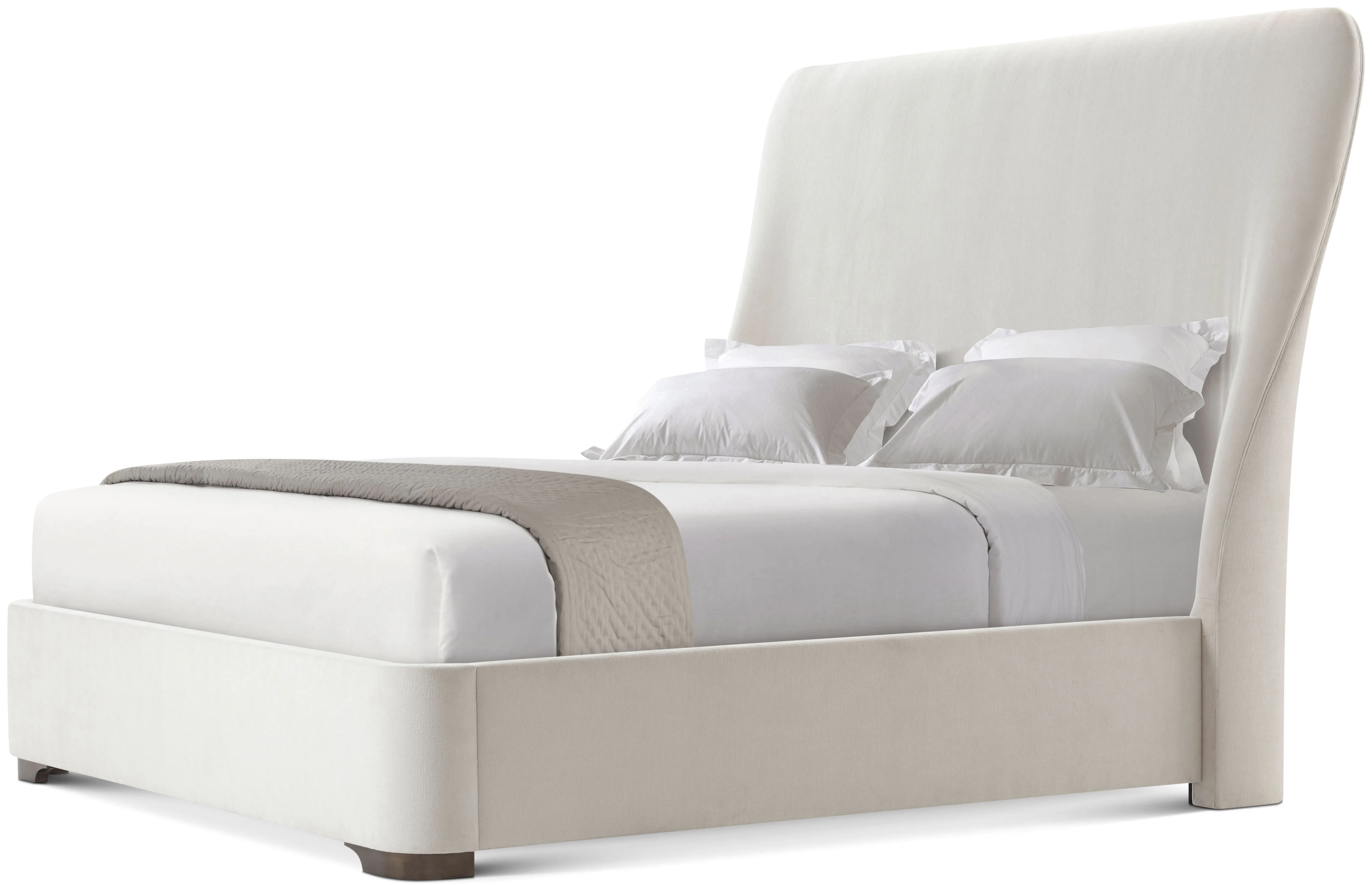 The Essence Upholstered US King Bed creates an air of serenity with soft curves and luxurious fabric. Fully upholstered, the frame gently rests atop white oak feet.
