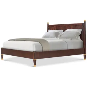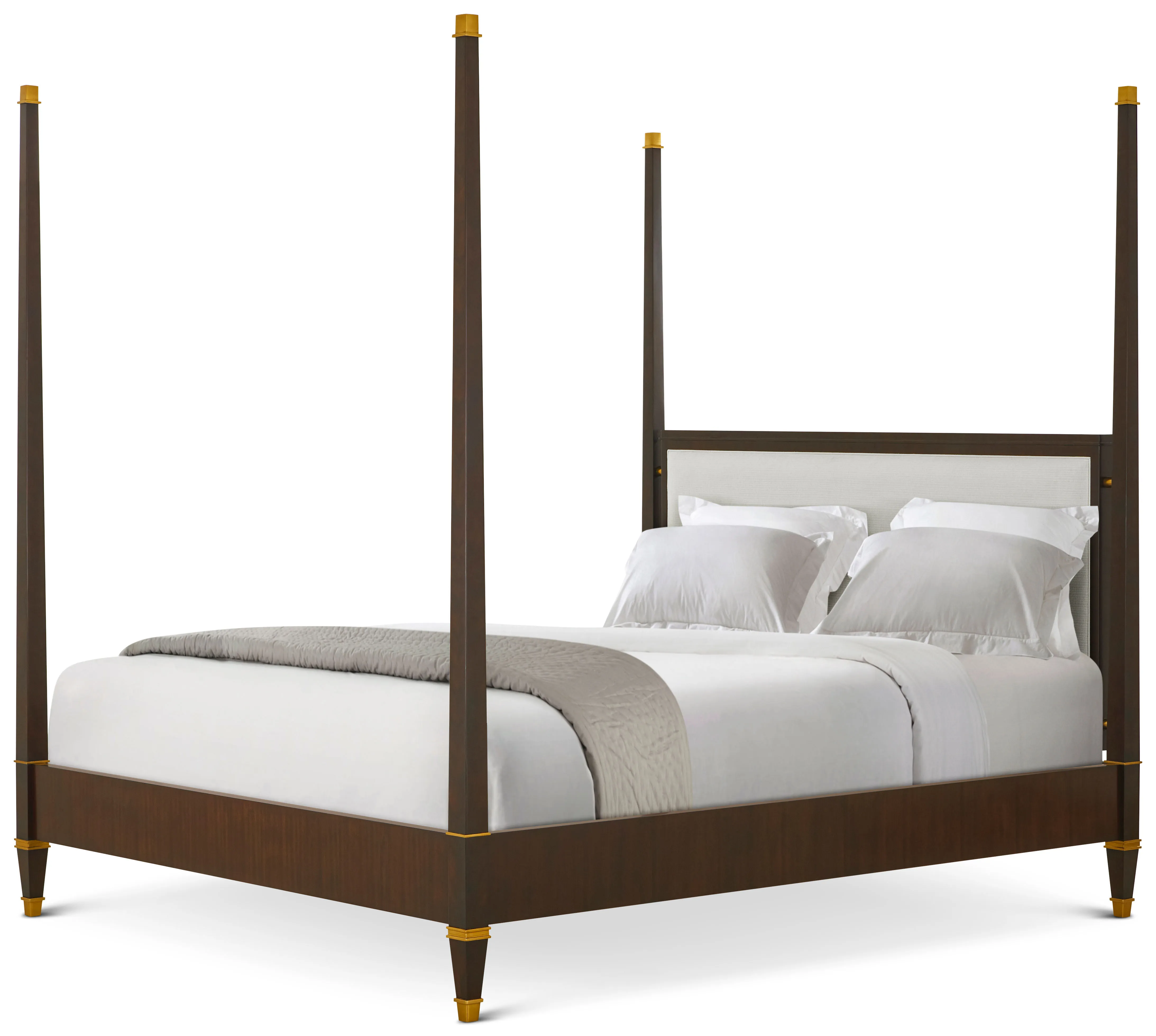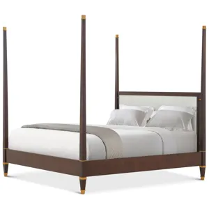 The Markos Upholstered Poster Cal. King Bed offers a striking modern imagining of classic Art Deco design. Serving as the defacto centerpiece of the bedroom, this grand four poster bed features an expertly upholstered headboard offering a touch of softness against sleek features like stout tapered legs with Hampton Brass caps alongside lustrous matching decorative ferrules. Markos has been handcrafted from khaya swirl and is finished in a choice of two colorways, Cambridge or Geo Coast.