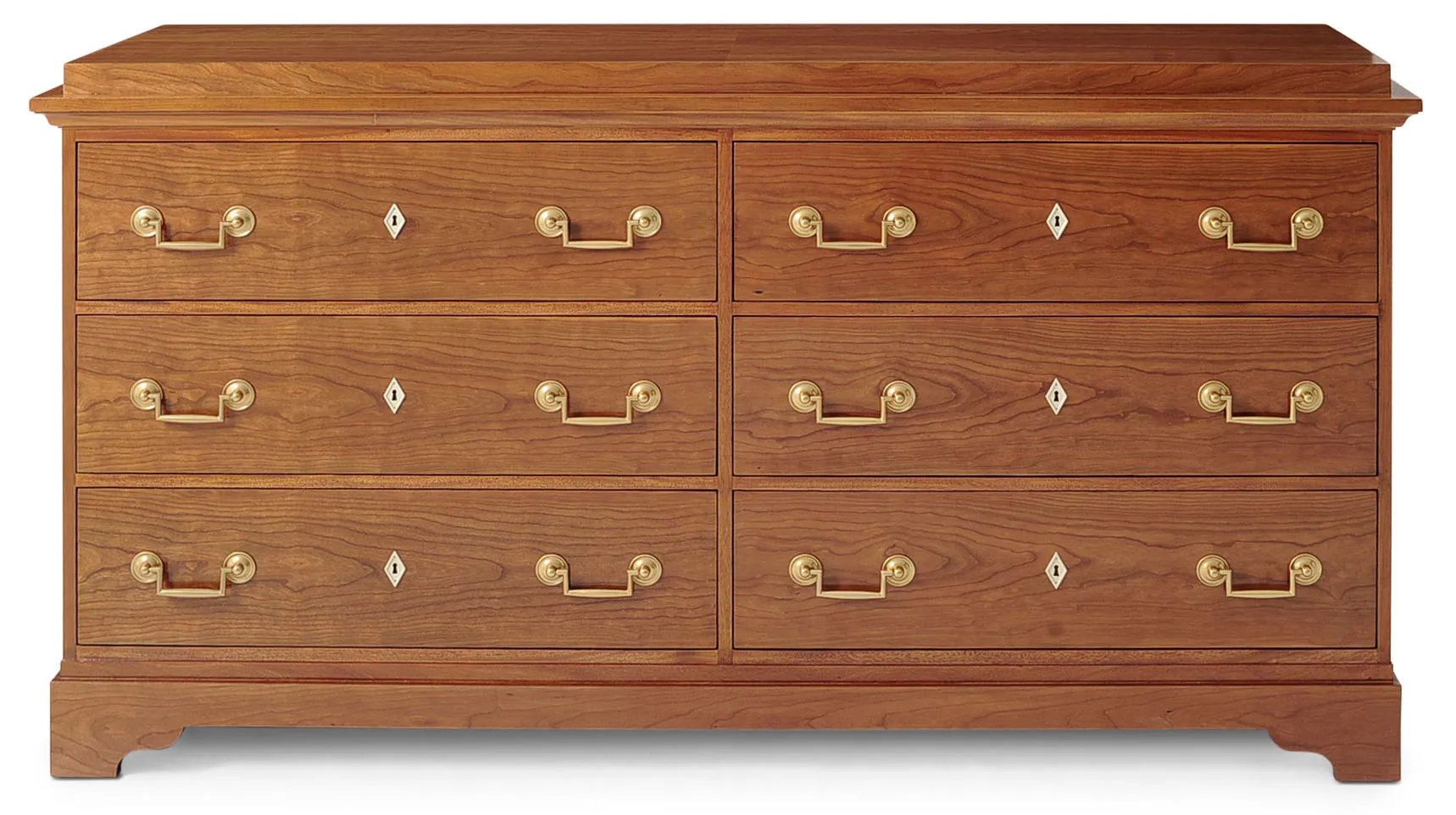 A Biedermeier moment, architectural detailing shines in the six-drawer Viggo dresser fitted with brass handles (in Hampton brass finish) and ivory-finish escutcheons. Beautiful stepped-caddy dresser top and bracket feet. Solid Cherry and veneers.