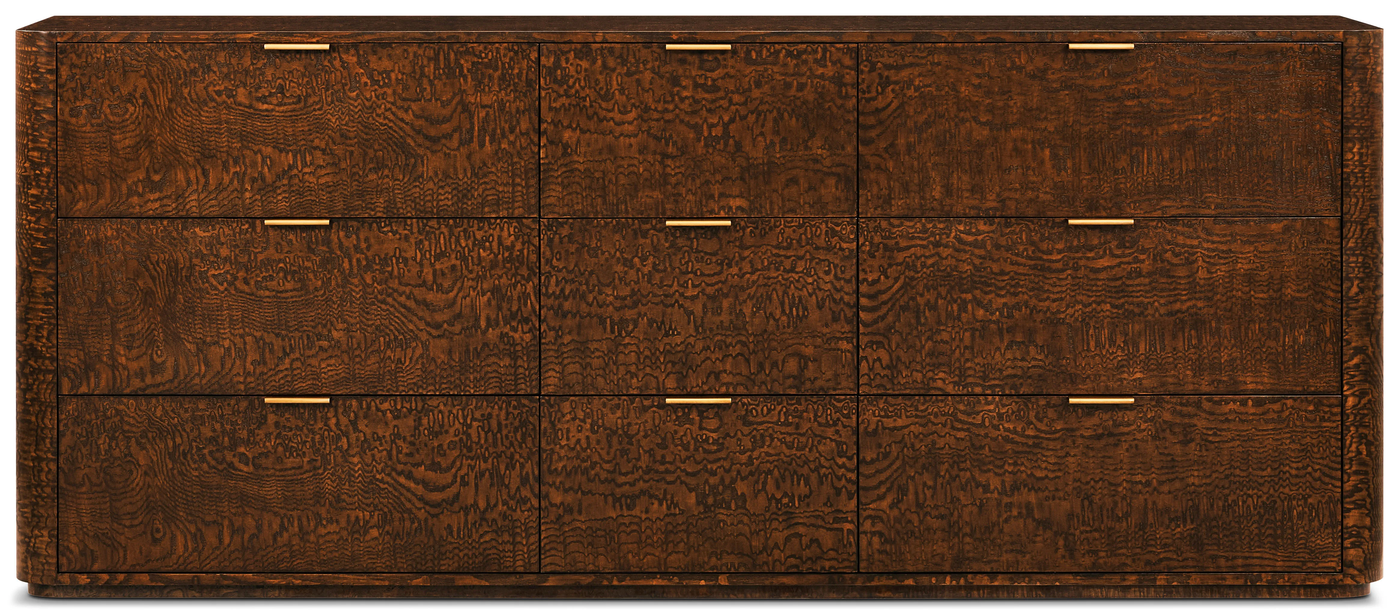 The Kesden Large Dresser embodies elegant design with graceful curves and meticulous craftsmanship. Stunning, hand forged hardware creates a delicate contrast to the rich Tamo ash veneer in this exquisite bedroom masterpiece.