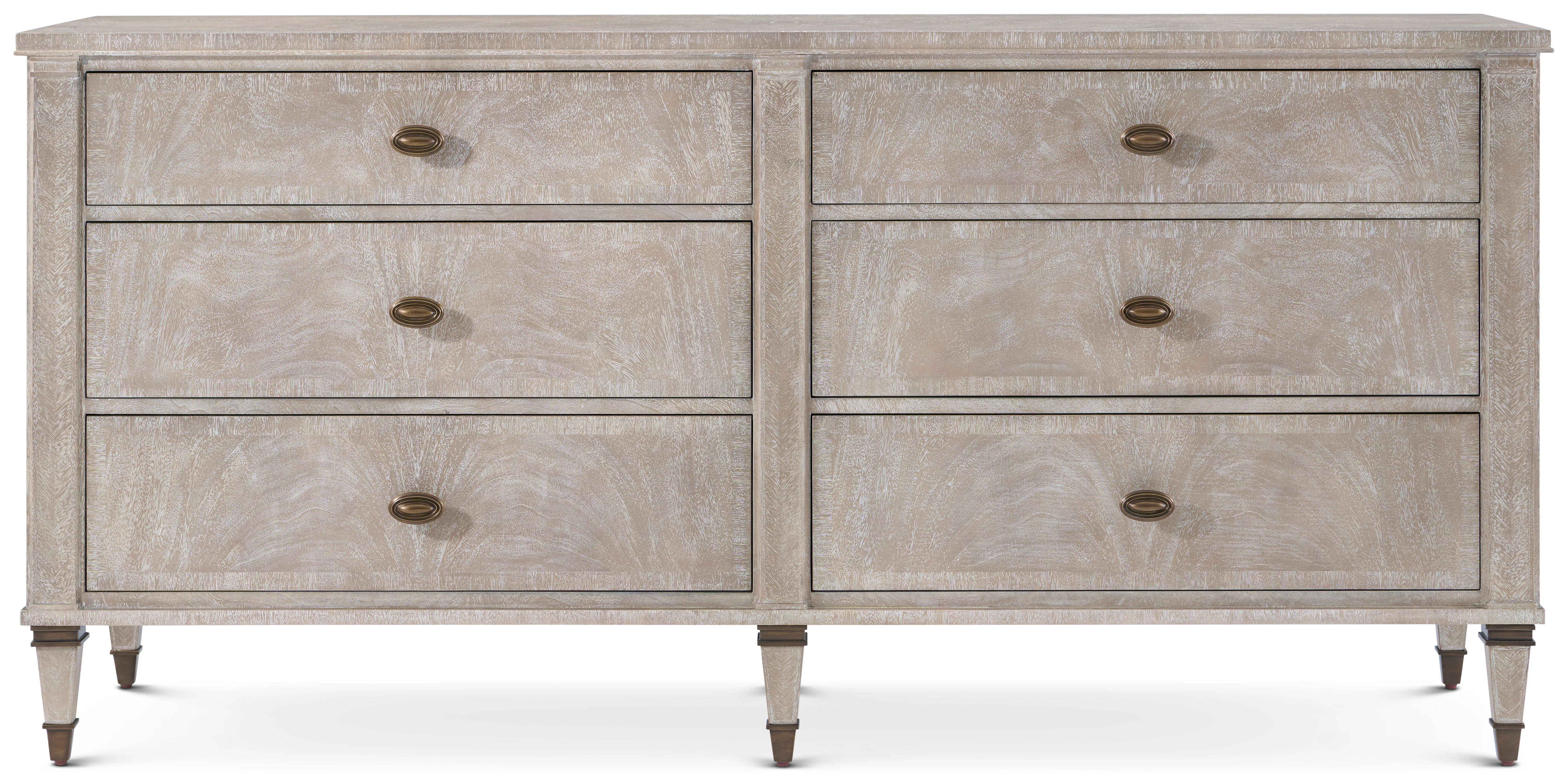The Faulkner 6-Drawer Dresser pays homage to the elegant minimalist era of Art Deco design. This spacious dresser offers three stacked rows of drawers, each offset by a lustrous elliptic Hampton Brass drawer pull. An excellent companion piece for the Marlborough Collection's beds and nightstands, Faulkner features stout tapered legs with brass caps and matching decorative ferrules. Faulkner has been handcrafted from khaya swirl and is finished in a choice of two colorways, Cambridge or Geo Coast.