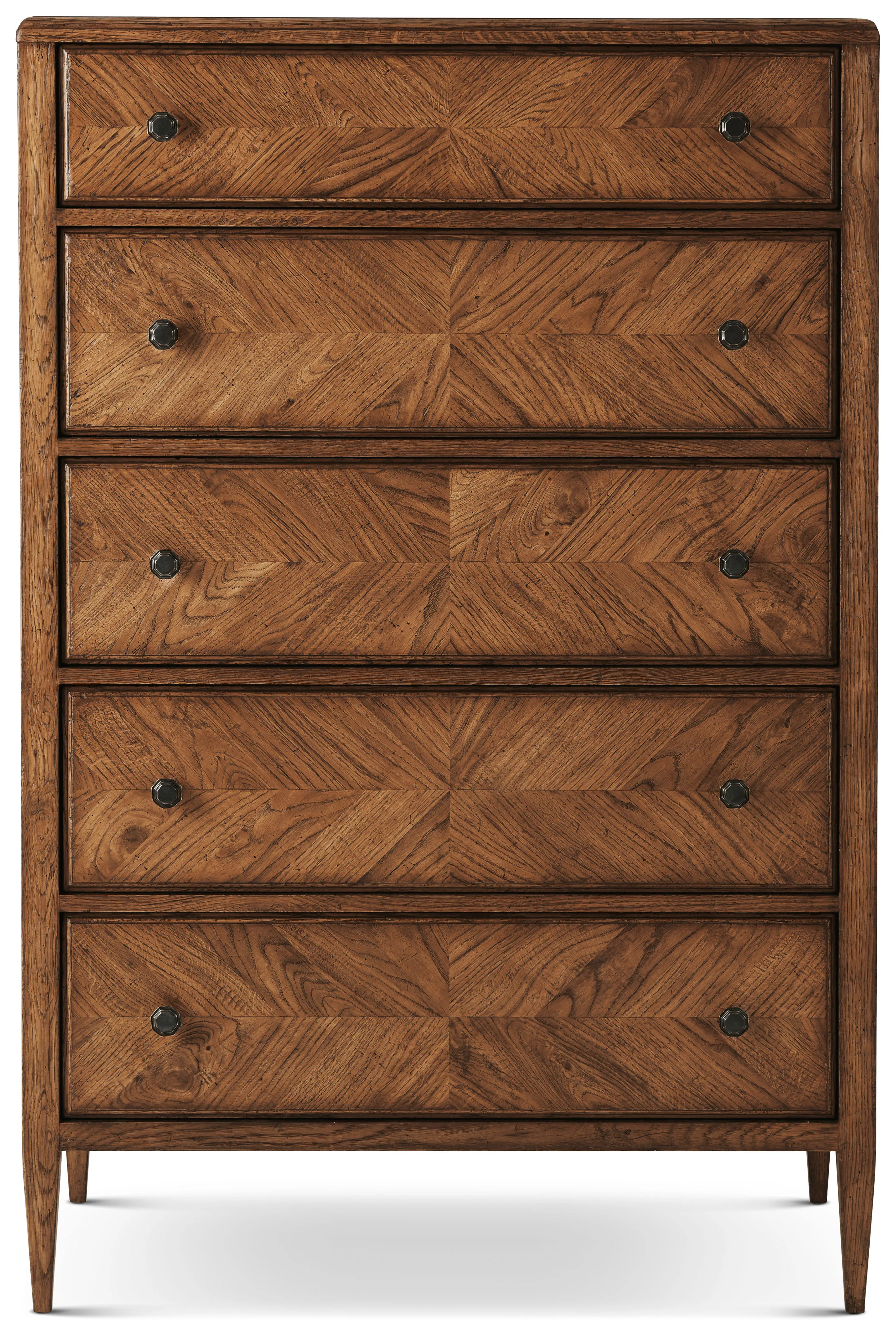 A statement piece for any bedroom, NOVA’s Tall Chest, seen in our Dusk finish with mirrored herringbone oak parquetry is displayed on a tapered oak leg with five deep drawers with Verde Bronze finished handles.
