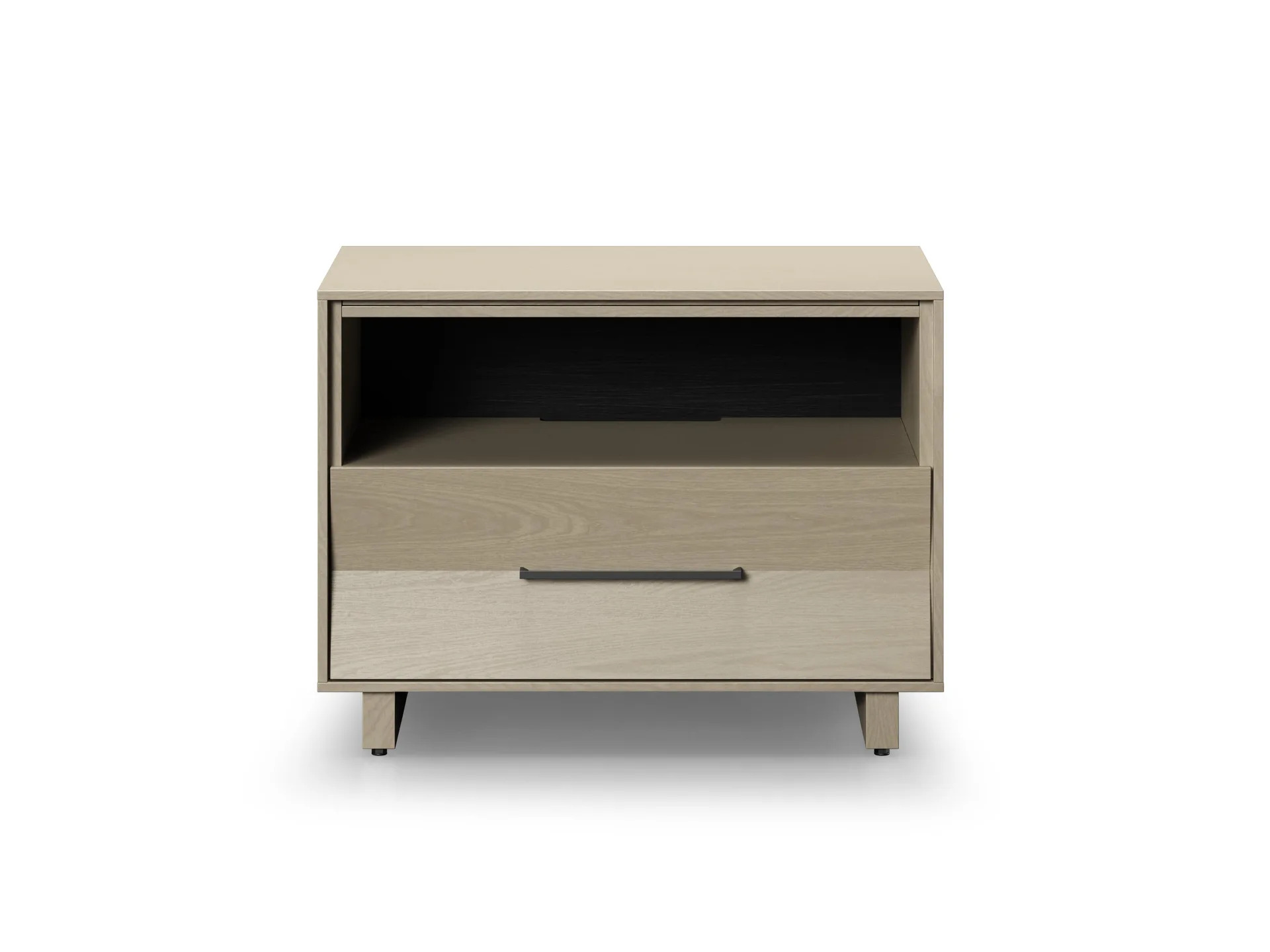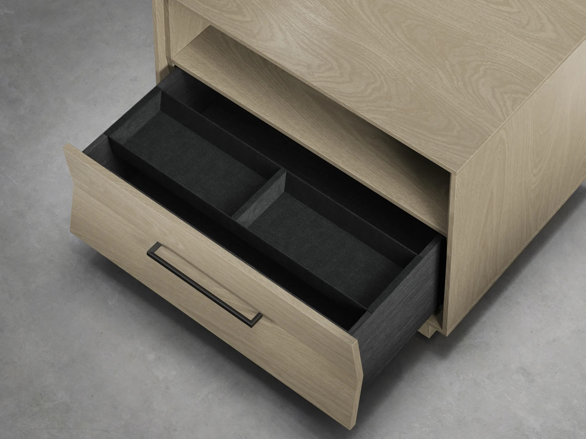 KAVA Nightstands offer versatile bedside storage, starting with a spacious open shelf—perfect for keeping frequently used items within reach, with built-in wire management to keep cords tidy. Below, a soft-close drawer provides concealed storage, complete with a removable velvet-lined tray for organizing smaller essentials.Beyond the bedroom.