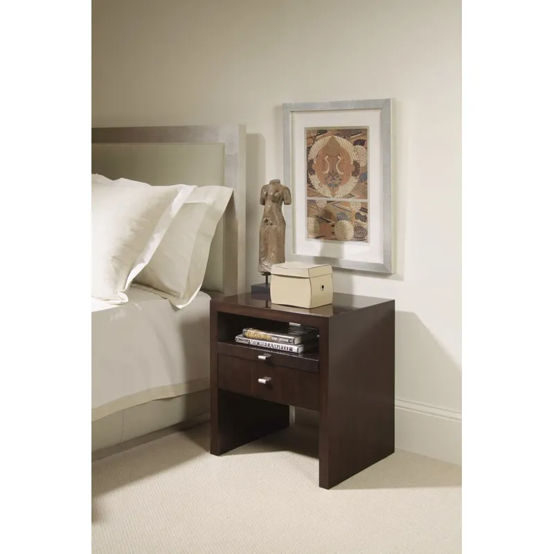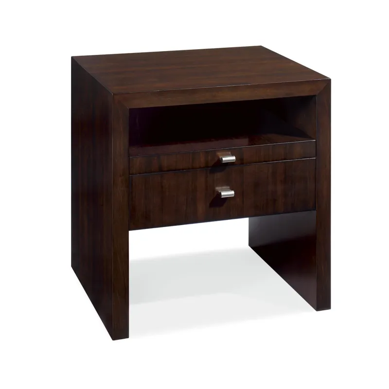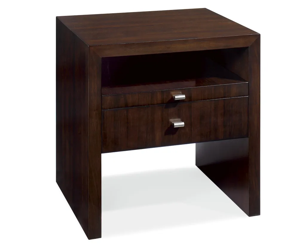A single drawer suspended between simple panel ends, this bedside table is a masterwork in satin walnut veneer. Open storage compartment over pull-out tray. “Soft close” glide option on drawers. Hardware finished in Soft Silver or Bronze.