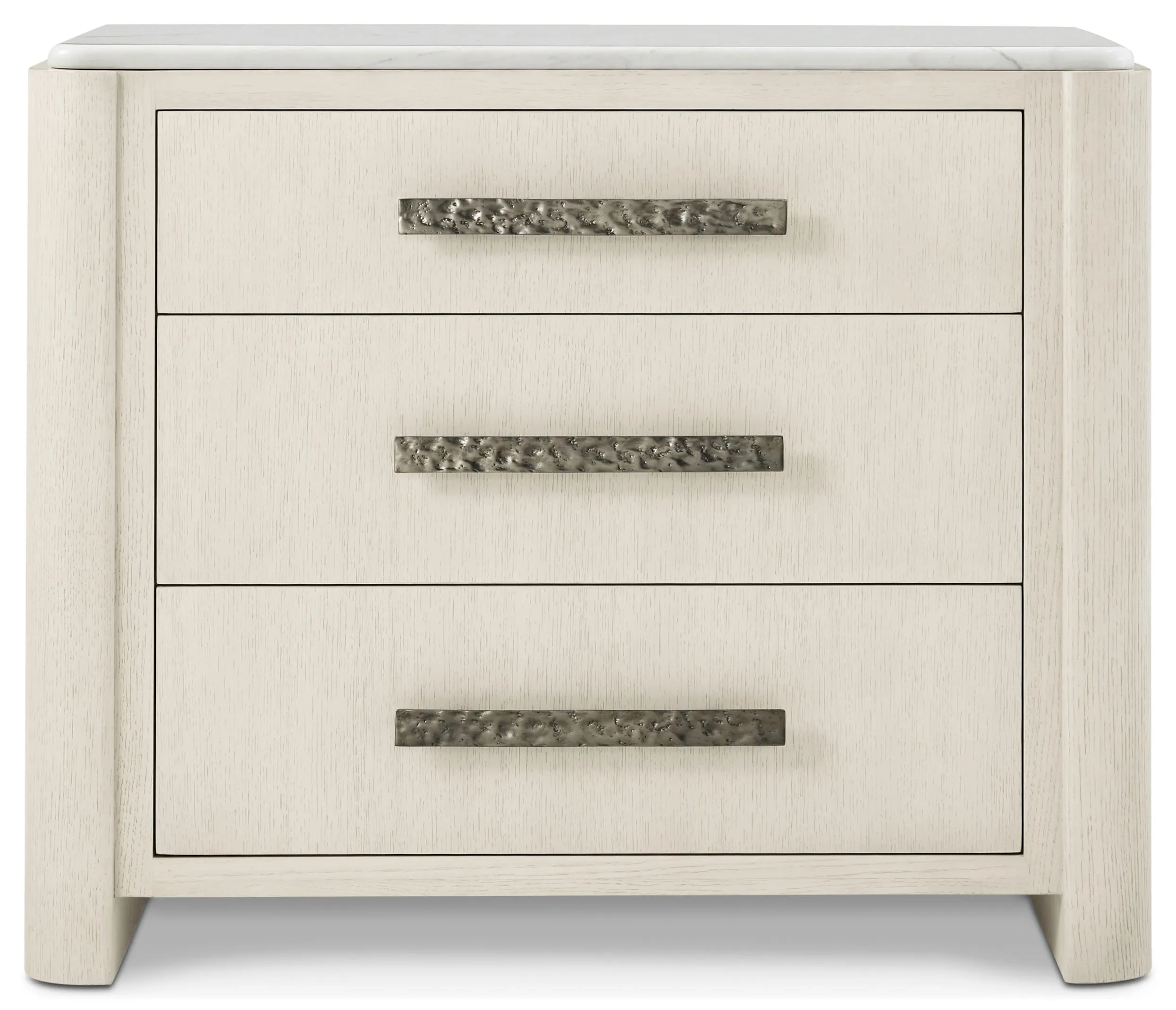 Honed marble delicately rests atop the exquisite white oak frame of the Essence Three Drawer Nightstand. An alluring focal point with graceful curves and hand cast metal hardware.