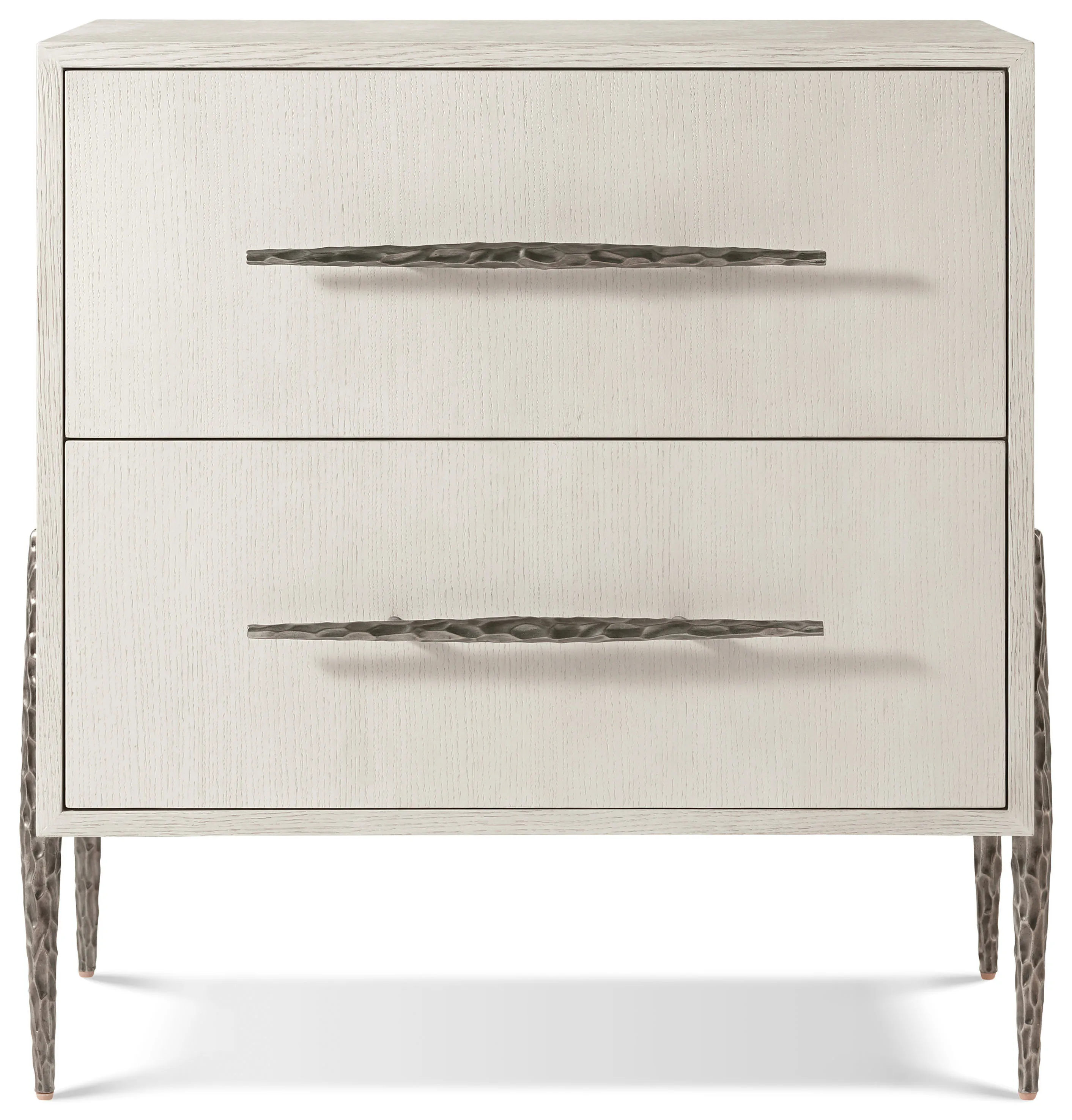 The Essence Two Drawer Nightstand gracefully contrasts hand textured metal pulls with an exquisite white oak frame. Perched delicately atop tapered legs.