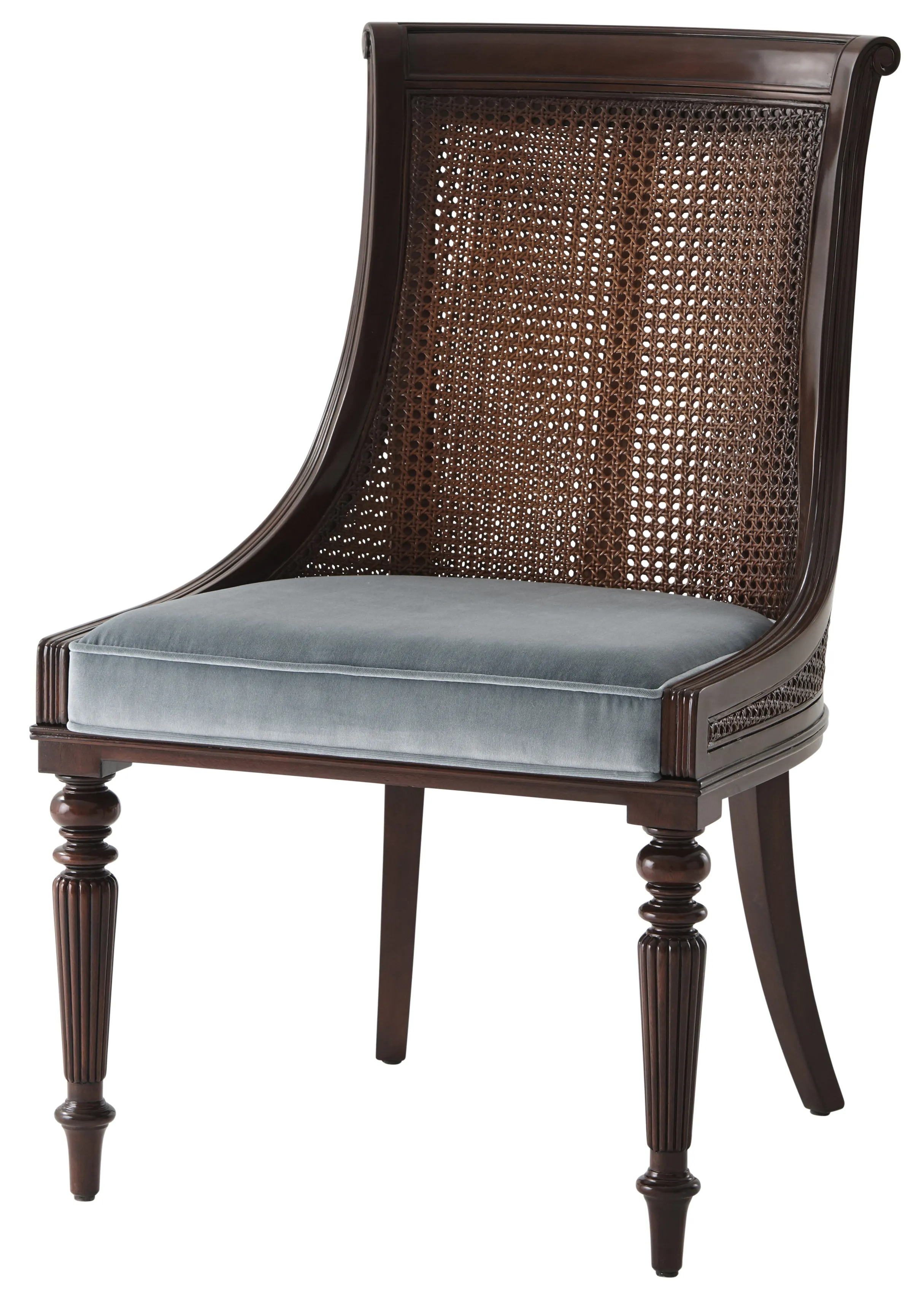 A hand carved mahogany scoop back dining chair, the panelled and double caned back above an upholstered seat, on turned and reeded legs.