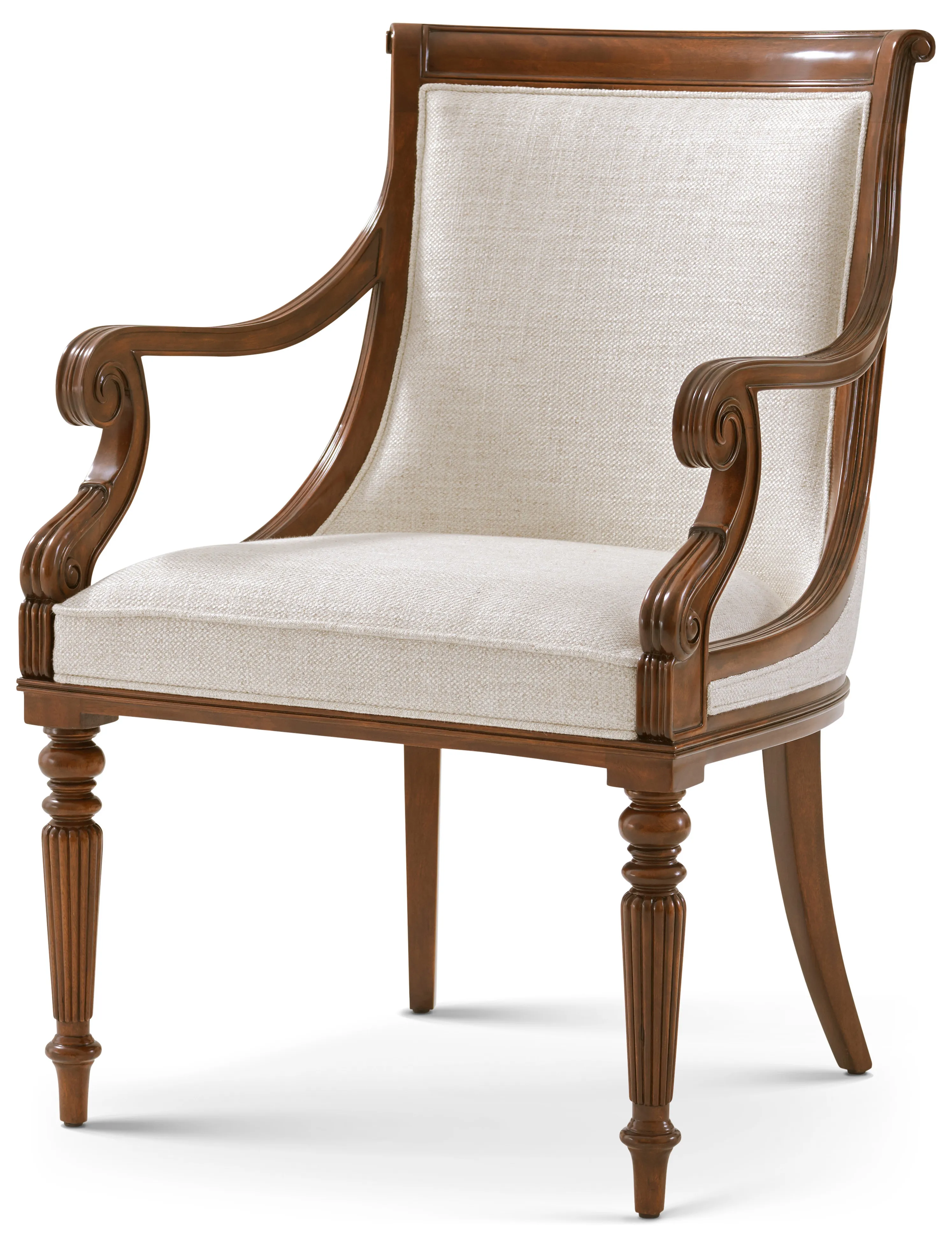 A hand carved Khaya scoop back dining armchair, the panelled and upholstered back above an upholstered seat flanked by scroll arms, on turned and reeded legs.