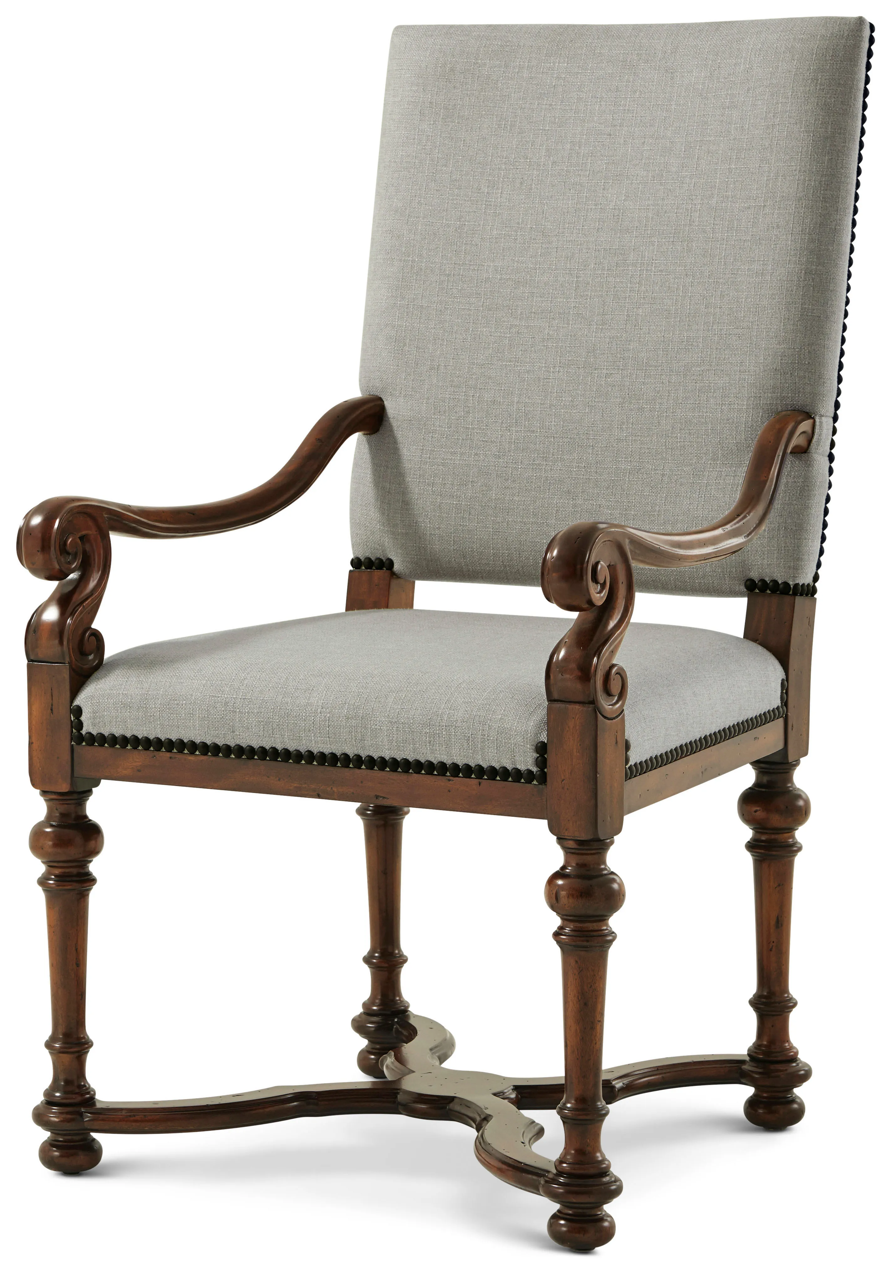A hand carved armchair, the rectangular padded back and upholstered seat on turned tapering legs joined by a wavy ‘X’ stretcher. The original William and Mary.