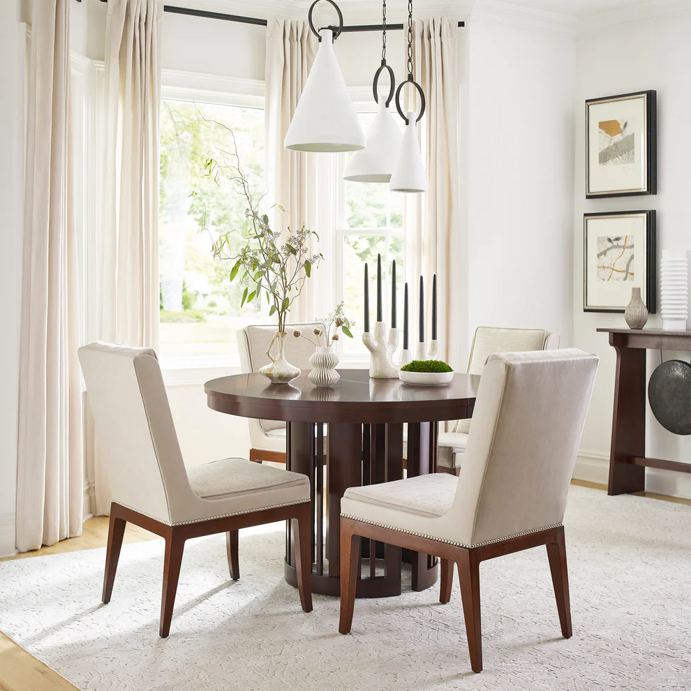 This beguiling table carves out a strong identity by alternating spindles with wider slats, creating a dynamic look and bringing lightness to the form. For flexibility in entertaining, the drum base and tabletop part at the middle to accommodate two 16-inch leaves.