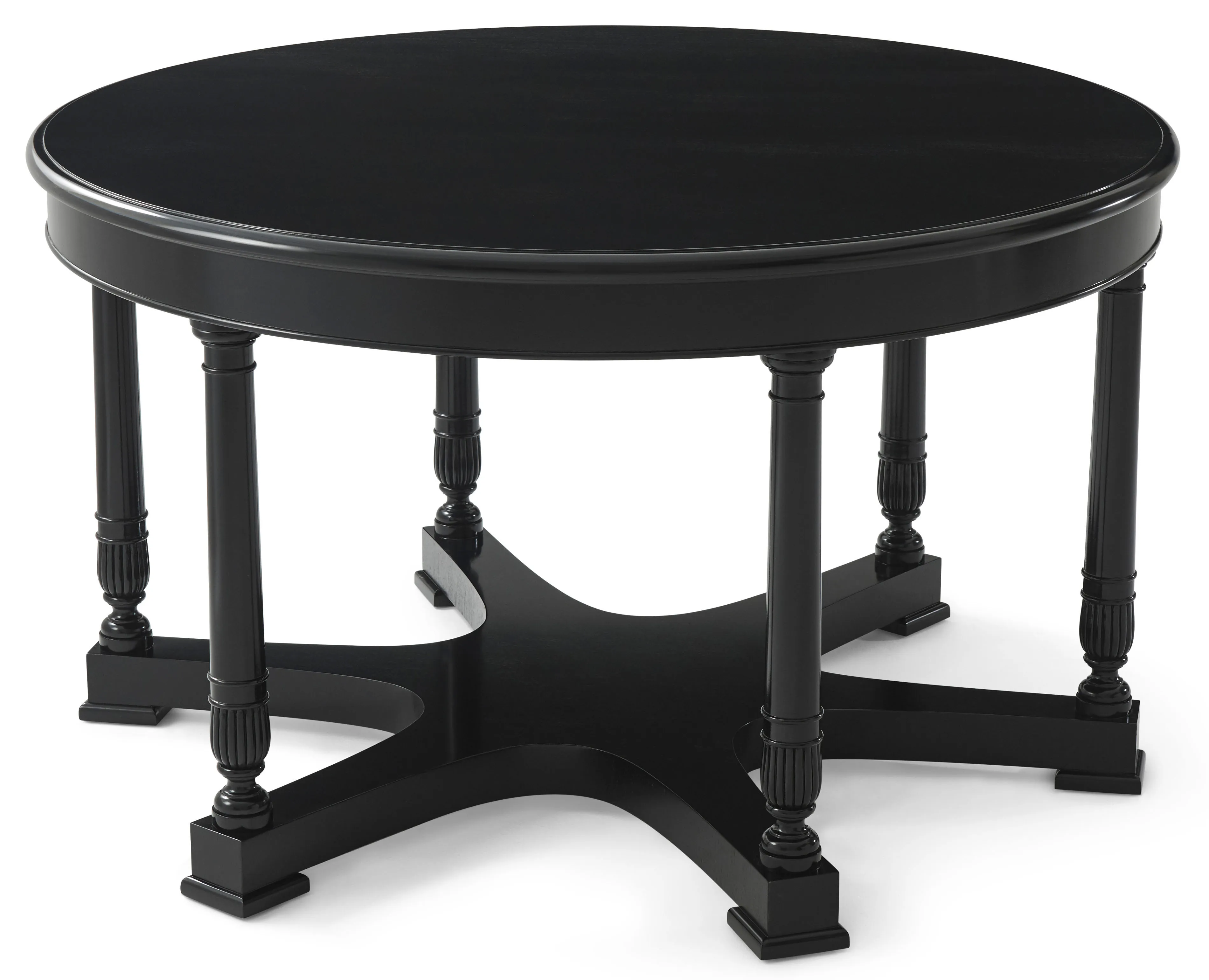 Columnar and sculptural, the Hinton Center table is destined for center stage. Six turned legs with reeded baluster carvings rise from a six-point star plinth base set on molded feet. Completed with a round molded-edge tabletop. Mahogany solids and veneers.