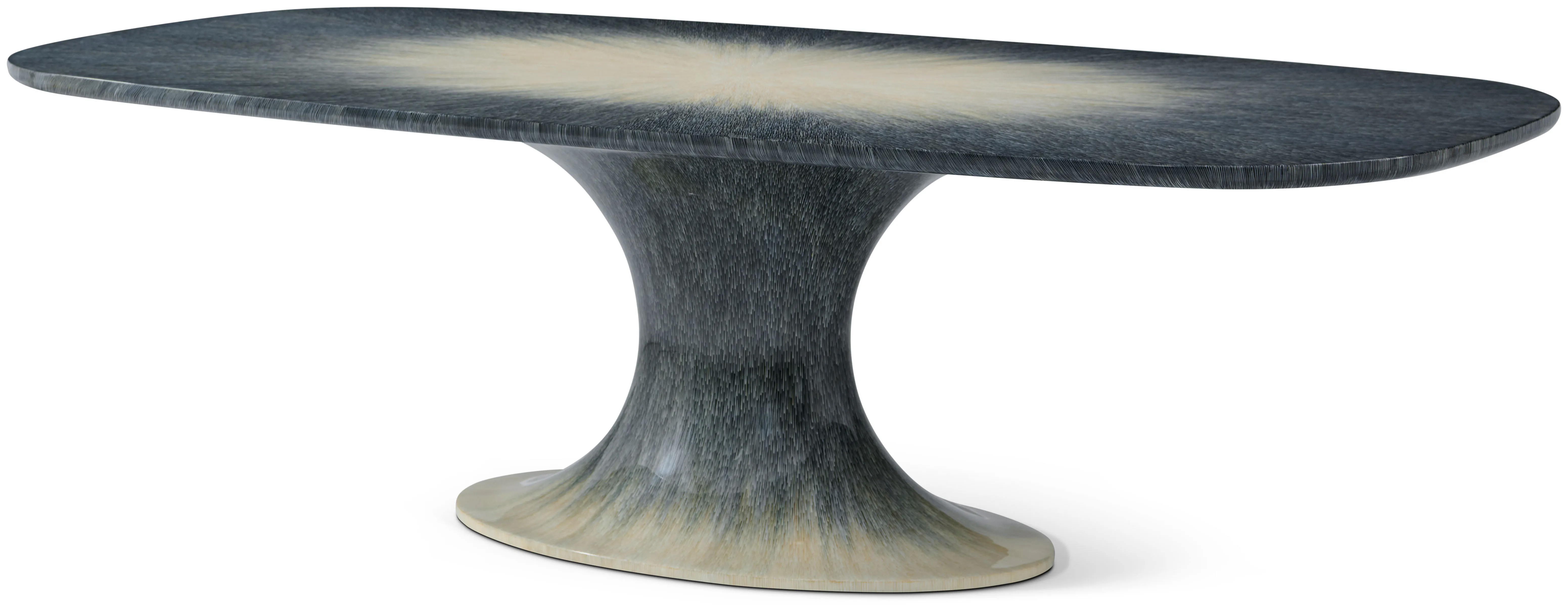 Inspired by mid-century modern design, the Panos Oval Dining Table features the collection's signature hand-painted linear starburst pattern across the surface, bringing the focal point to the center of the tabletop. The pattern flows down the curved support column and onto the round table base, offering perfectly styled, sturdy support.
