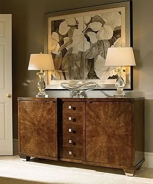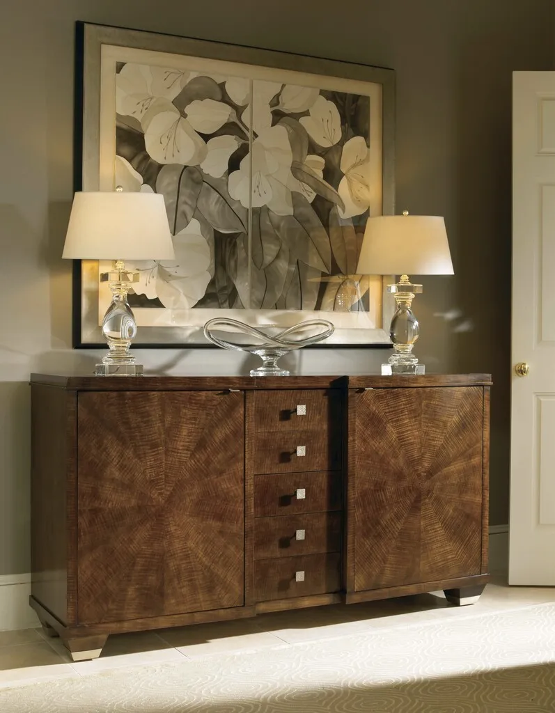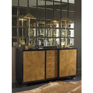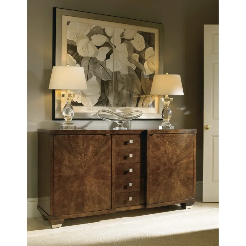 The natural character of Eucalyptus steals the spotlight in this elegant credenza- particularly on the pair of doors, where triangular veneers form a starburst pattern. One adjustable shelf behind each door. Five drawers, the top one lined with slivercloth. Textured square metal pulls in a nickel finish and ferrules on all four feet. Shown here in Century's custom finishes, it is also available in stocked Sable finish as 55H-403 for quick shipping.