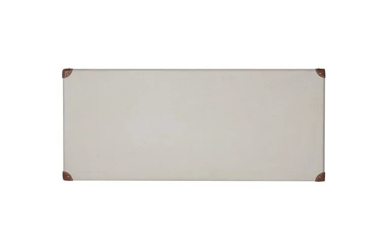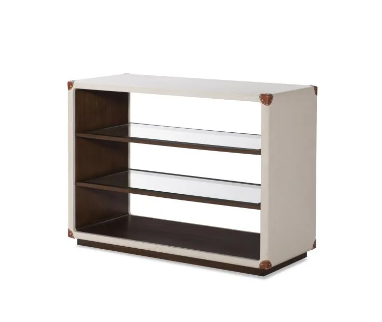Two fixed shelves with glass inserts above open shelf at base. Decorative leather & brass nail head trim corner accents
