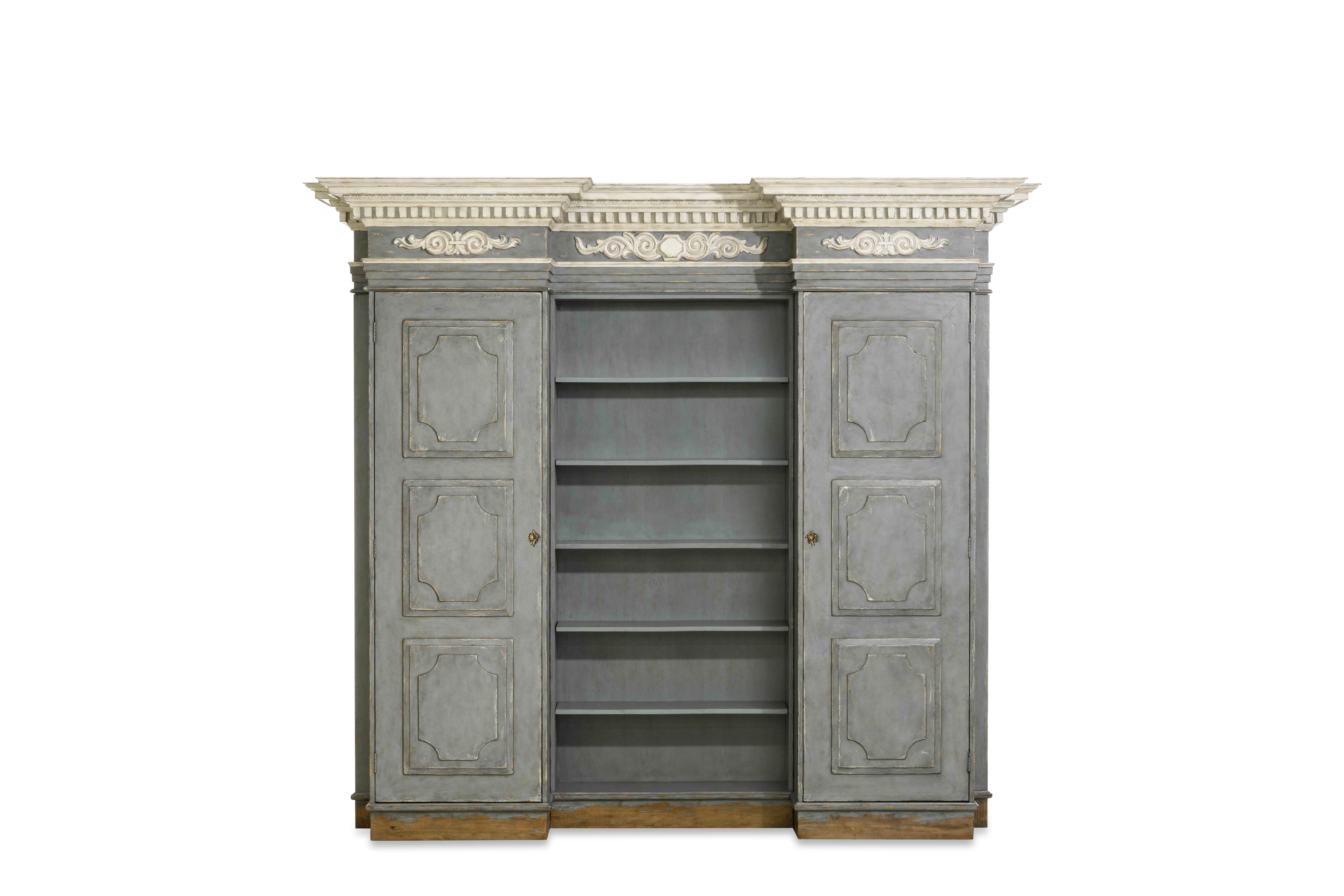 Inspired by a 19th-century French bibliotheque with neoclassical dental molding cornice and raised panel doors exemplifies the neoclassical revival that occurred in European furniture design, particularly in France, during this period. This styleembraced elements from classical antiquity, such as the dental molding cornice, which added a sense of grandeur and historical continuity to the piece. The biblioteque not only served as a practical storage solution but also as a decorative element in interiors, reflecting the era's values of knowledge, culture, and refined taste, underscoring the importance of integrating classical aesthetics into everyday living spaces. Finished in a Swedish Aged Slate with Antique Brass faux key escutcheons, the insides of the left and right cabinet is finished in a natural wood stain with one fixed shelf at top, a hanging rod underneath and two adjustable shelves below. The center bookcase has one fixed shelf at center and two adjustable shelves above and below.