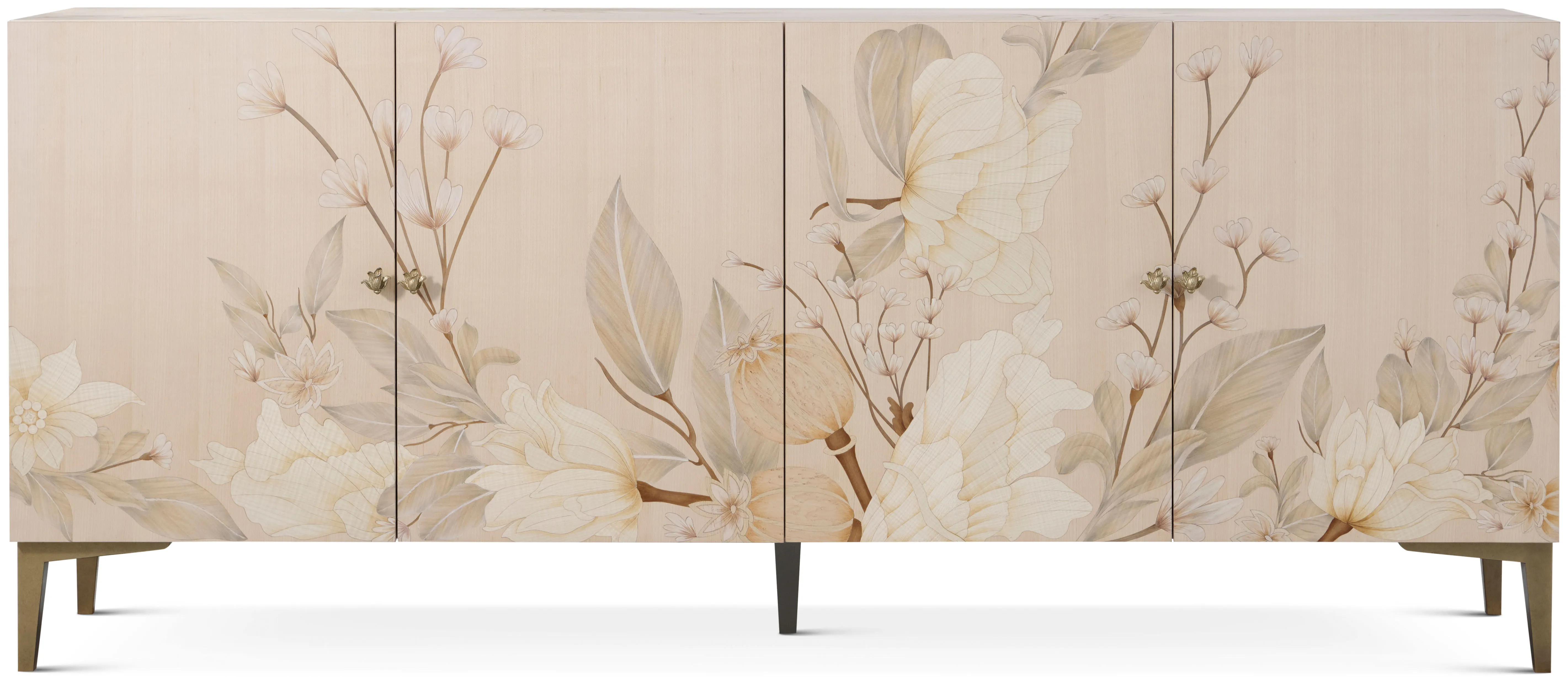 Converging at the intersection of versatility and beauty, the Bouquet 4-Door Sideboard features four hinged doors which open outward to reveal ample shelving space inside. This marquetry-adorned, multi-purpose cabinet is anchored by five stainless steel legs and accented with coordinating stainless steel hardware. Available in our beautifully neutral Cashew and Buttercream finishes.