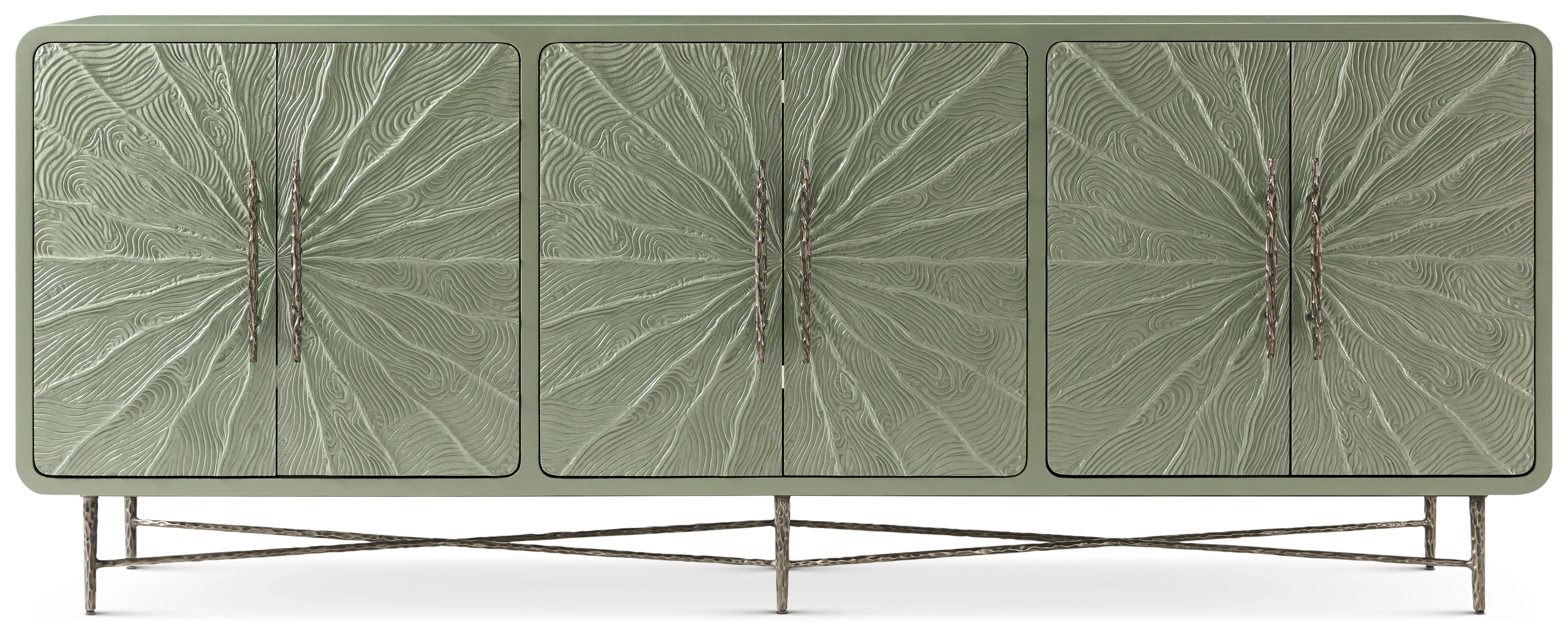 Graceful curves meld into the rich textures of the Essence Media Cabinet. Handcast and meticulously crafted, six doors showcase a stunning sunburst wood grain pattern atop a textured metal X-Base. Versatile and functional, this cabinet includes ventilation and openings for electrical components and one adjustable shelf.