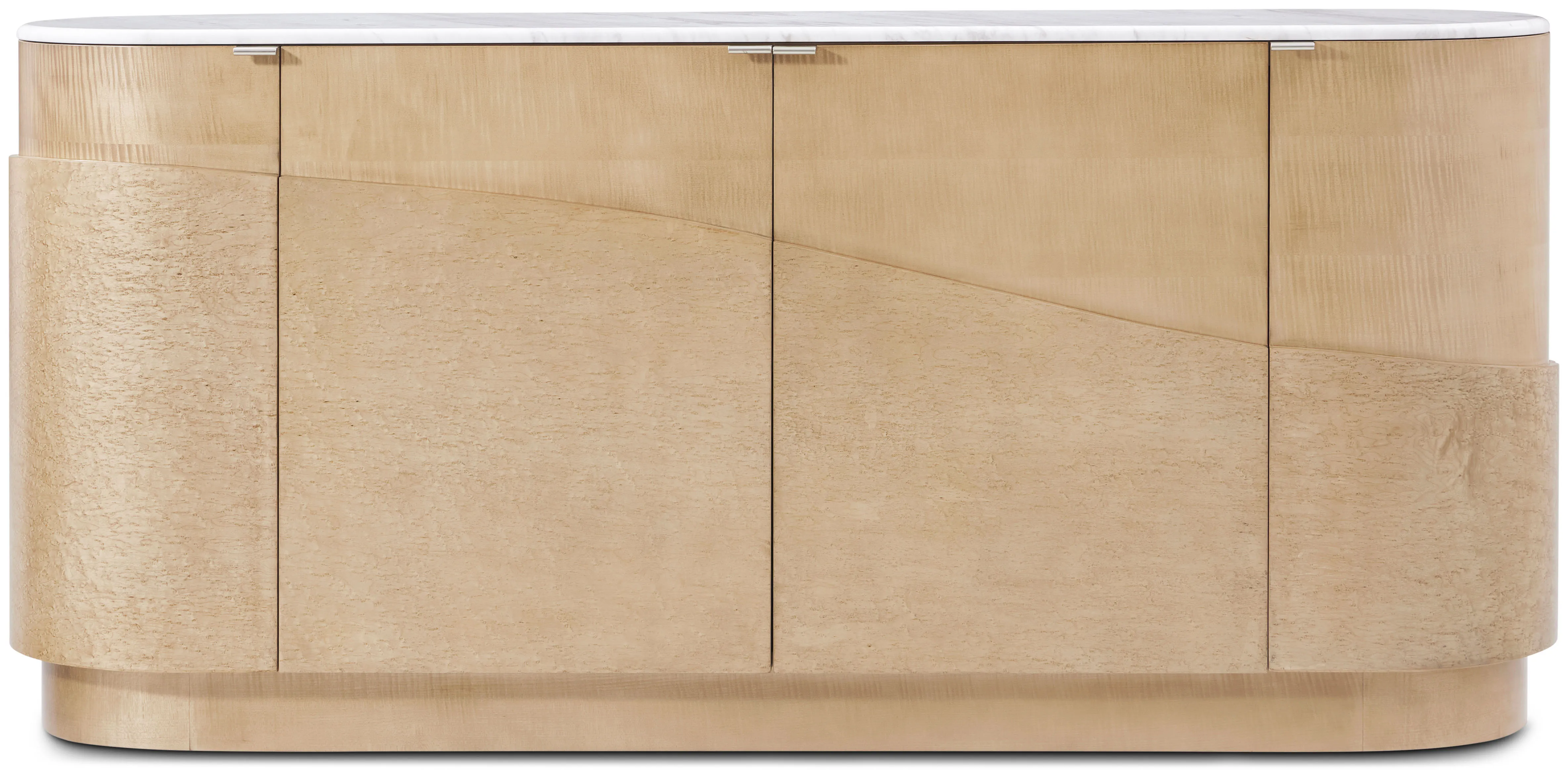 In the Origins Buffet, beneath a polished Volakas Arebescato marble surface, figured sycamore and birdseye maple combine into an exquisite mixed-material form. Beautifully accented by brass pulls in Starlight. Finished in Sesame or Landmark.