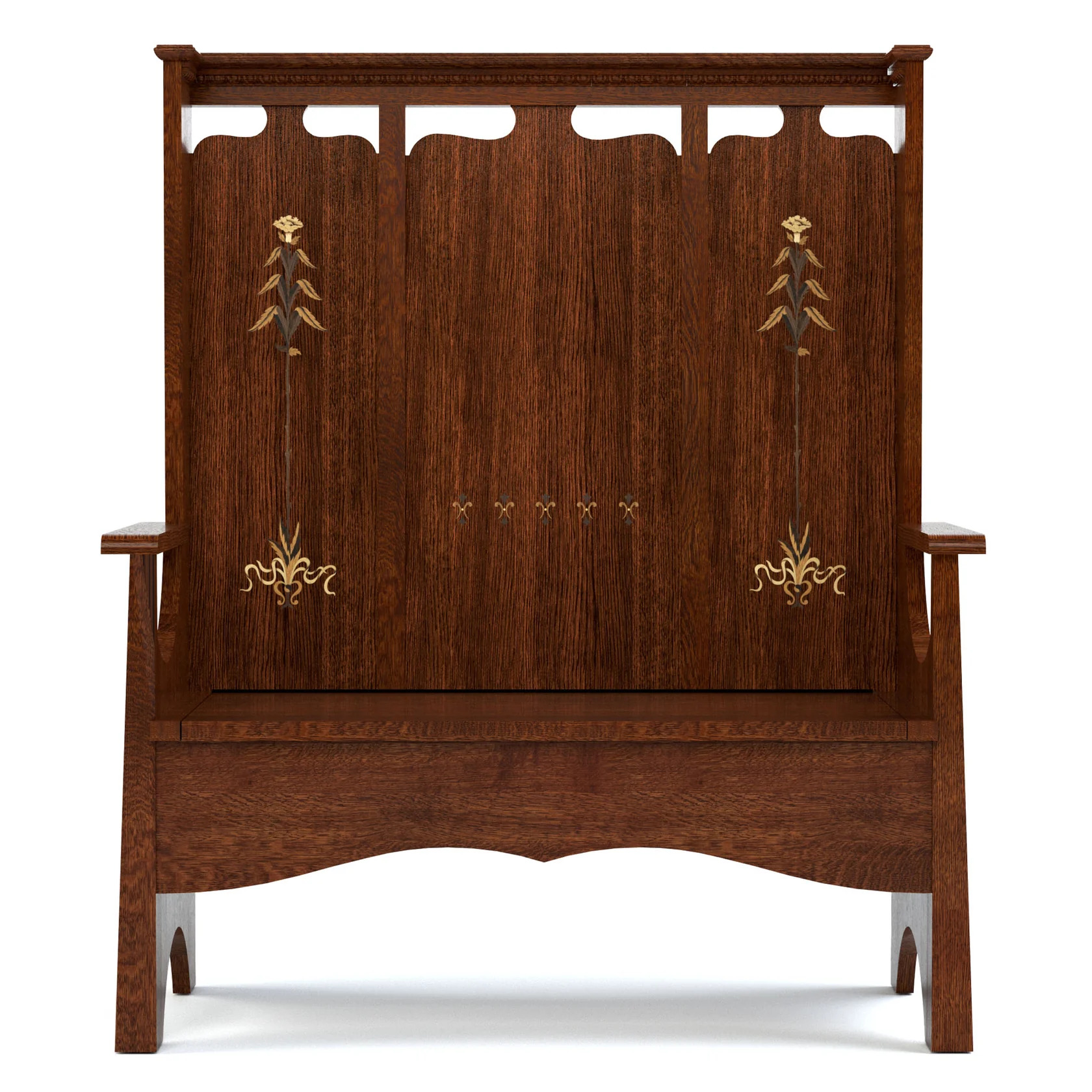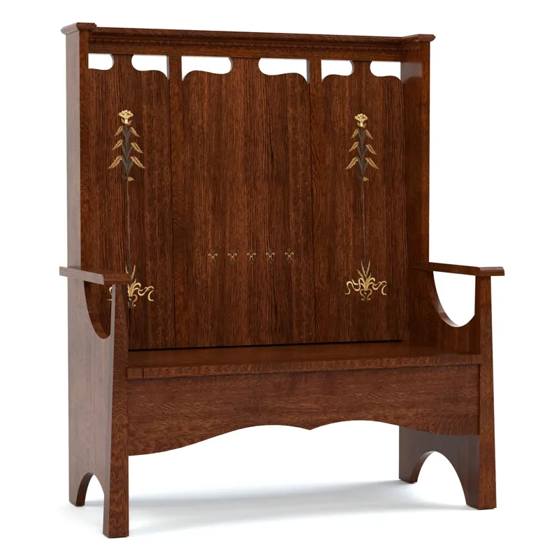 The Fireside Bench, based on a 1902 Stickley Bros. design, is the type of high-backed settle that was often positioned in pairs near a fireplace, creating a cozy nook that held the fire's warmth. Our 125th Anniversary version is a versatile, eye-catching storage bench that lends itself to entryways, mudrooms, living rooms, and more. Crafted of quartersawn white oak, its noteworthy features include a slightly pitched triptych-style back, a hinged seat concealing a storage space, and a stunning inlay design with subtle shading and detail created by carefully burning the veneer.