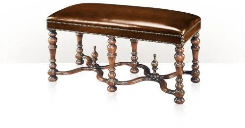 A hand carved window seat / bench, upholstered seat, studded decoration, turned legs and wavy 'x' stretcher. The original William and Mary.