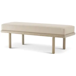 A hand carved and upholstered long stool, the caned top with a cushion seat on turned legs joined by an unusual stretcher of C ends joined by a central bar. Inspired by a Louis XVI original.