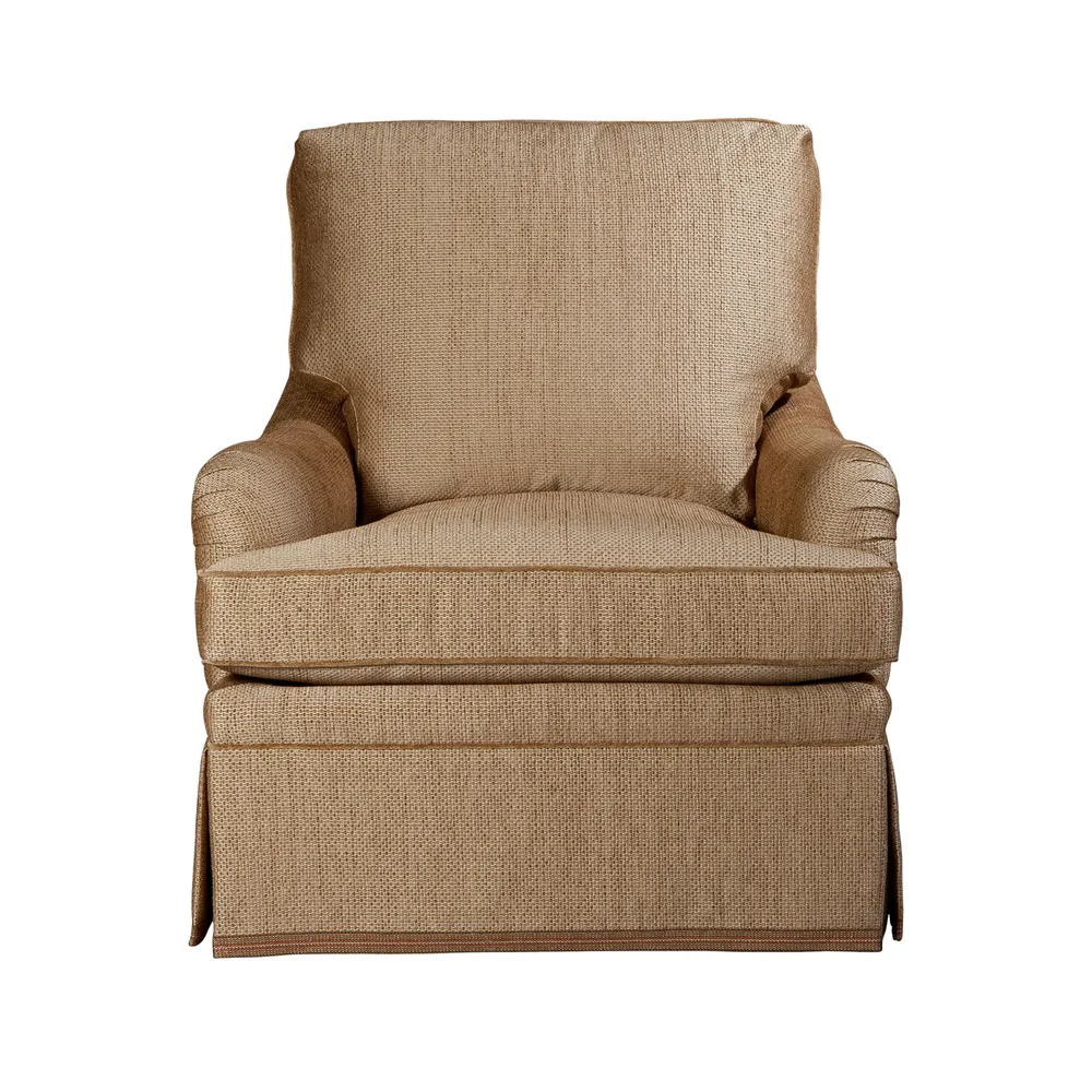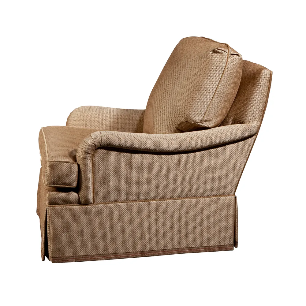 An upholstered armchair, the rectangular 'T' cushion back and seat enclosed by English arms, above a padded rail, on a skirted base. Inspired by a 19th century English original.