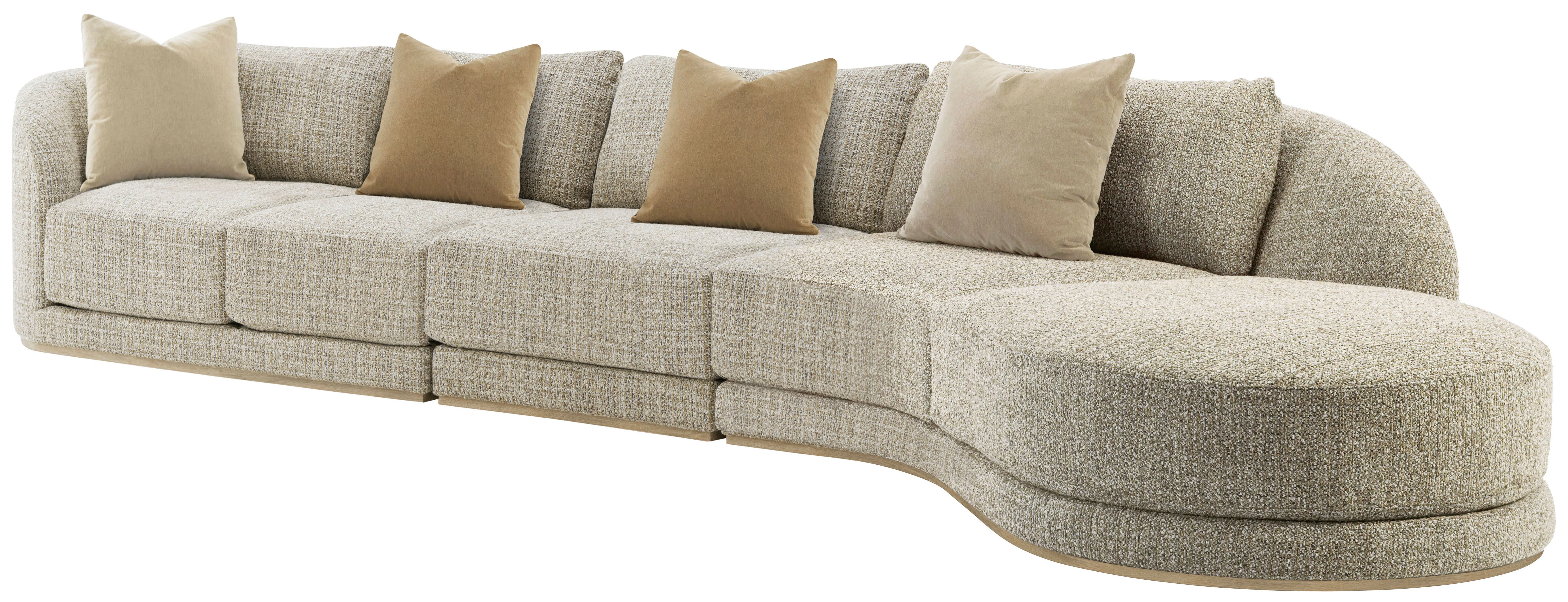 Exposed wood base anchors this contemporary design with generous seating and textural tones.