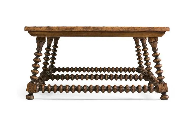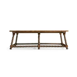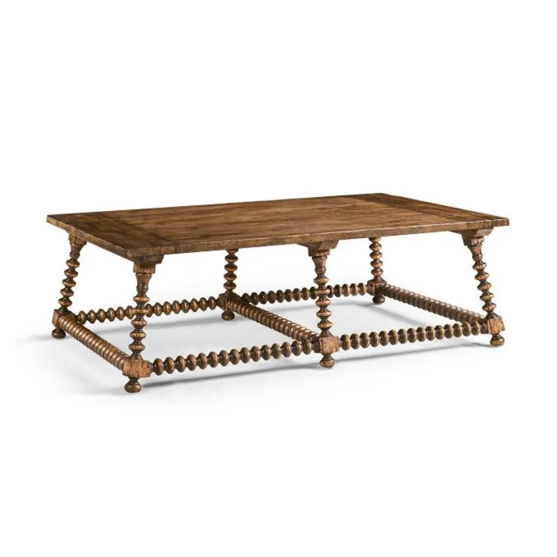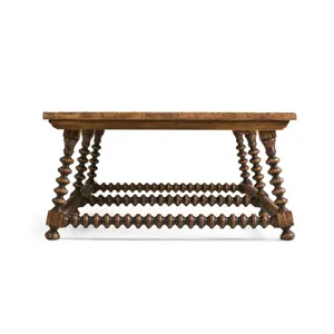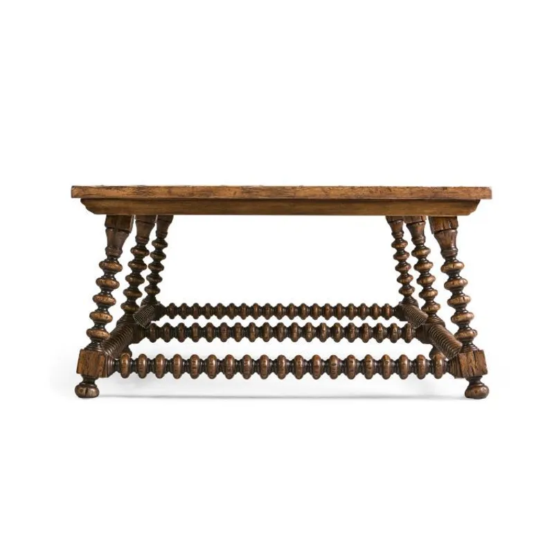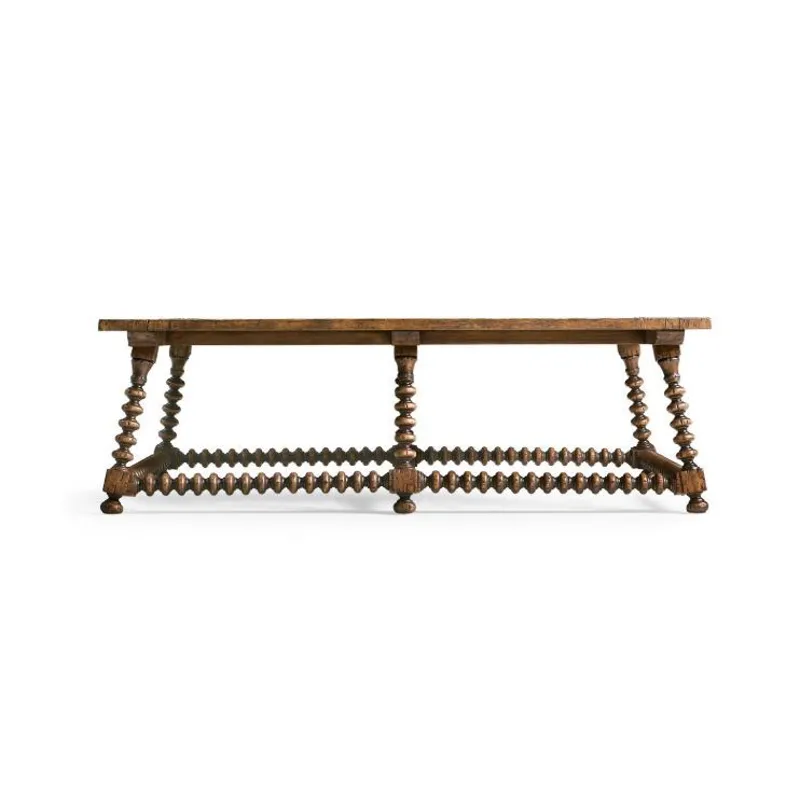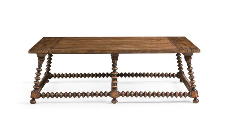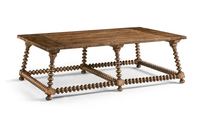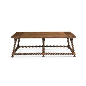The Tamarisk Cocktail Table is a bold statement piece, featuring a classic bobbin style design that adds both texture and charm to any space. Finished in a rich Medium Spain Walnut, the table boasts a warm, inviting tone that instantly enhances the coziness of your room. Its large size makes it a perfect centerpiece for gatherings, combining timeless design with functional elegance. The Tamarisk Cocktail Table effortlessly blends traditional craftsmanship with a modern sensibility, creating a welcoming and sophisticated atmosphere to the living space.