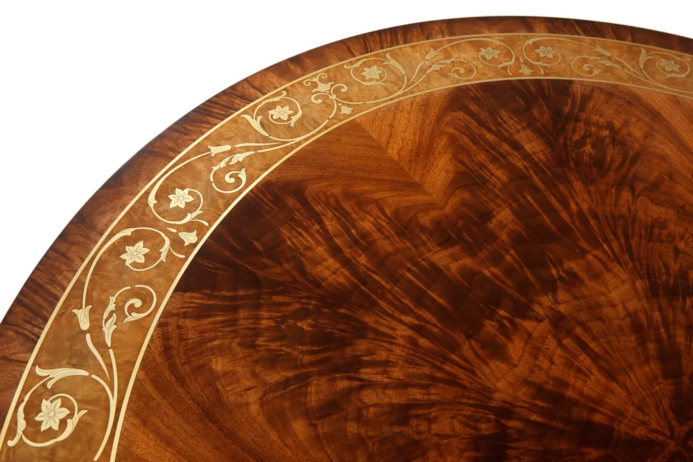 A flame veneered and mahogany, brass inlaid drum top centre table, the circular top inlaid with a band of scrolling leaves, the frieze fitted with a centre drawer, on a turned and tapering column with lapette carved base, on a concave sided brass strung plinth with rosette corners, on lobed bun feet.
