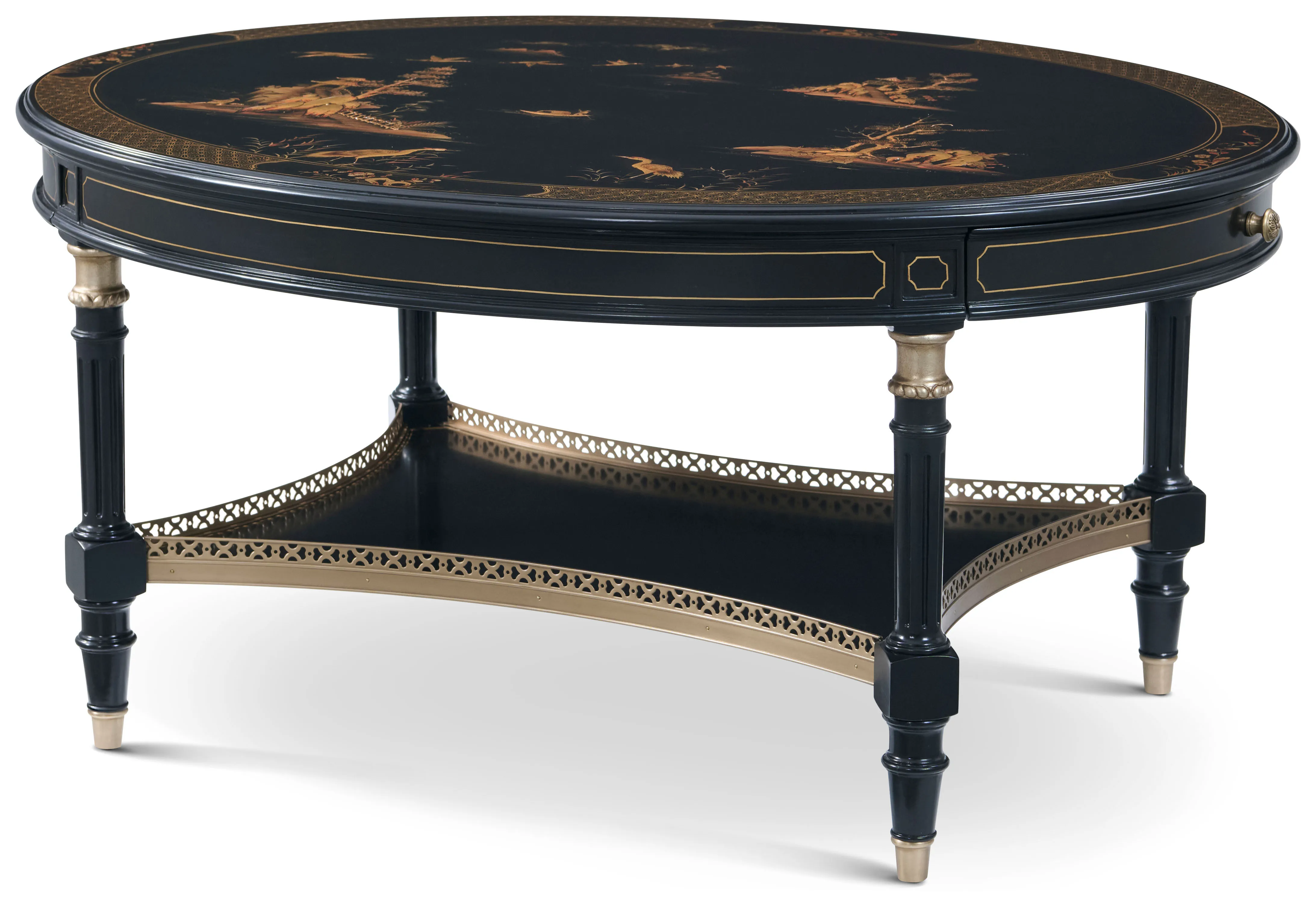 With an elliptic chinoiserie-adorned tabletop, the Terrace Cocktail Table brings a peaceful elegance to the spaces which it inhabits. Terrace features two drawers, carved ring-turned legs, a lower tier shelf with a decorative gallery rail, and cast steel accent hardware. Part of the deftly crafted Brushwork collection, this piece showcases the true mastery and skill-driven techniques of Theodore Alexander's master artisans.