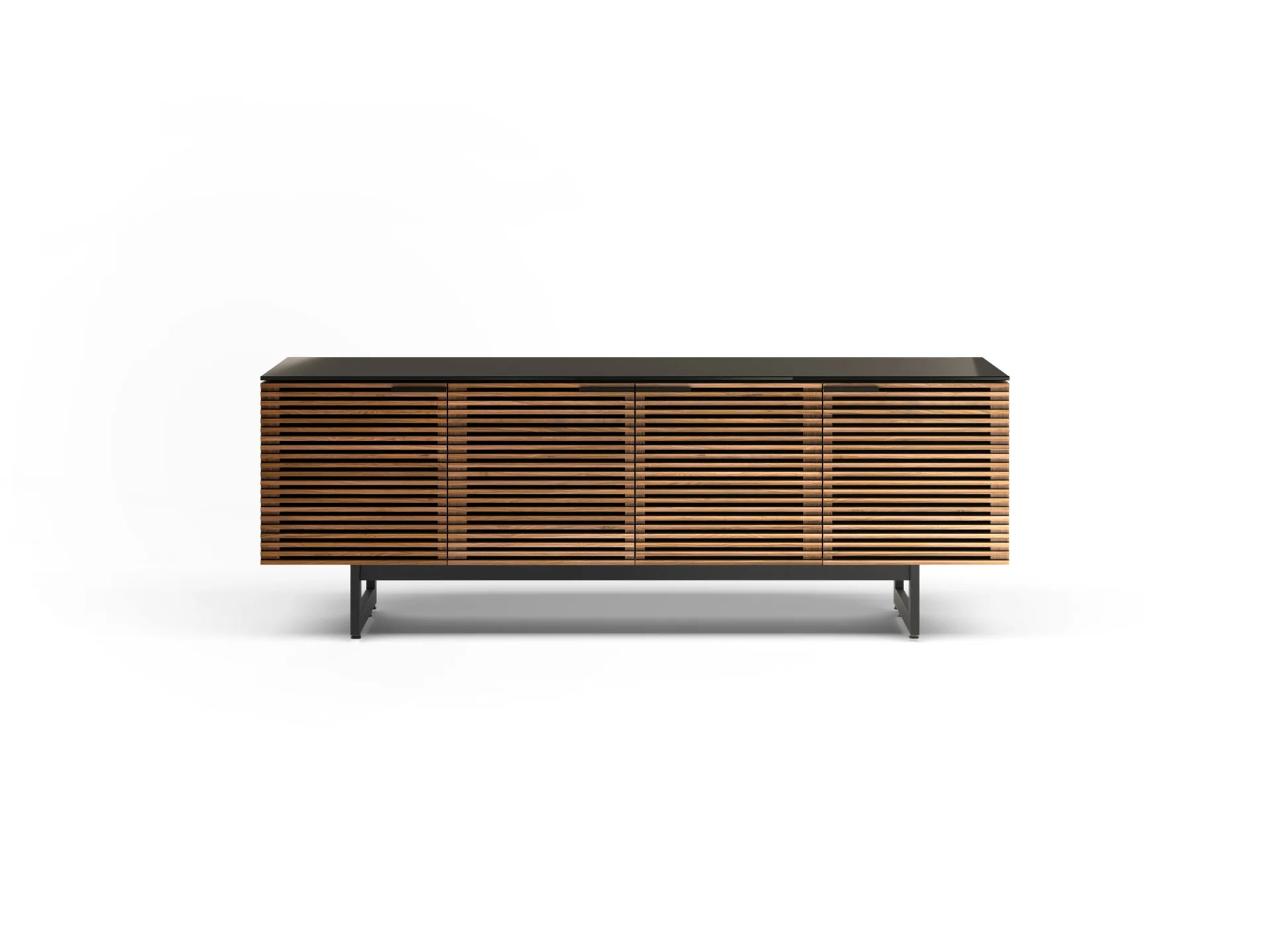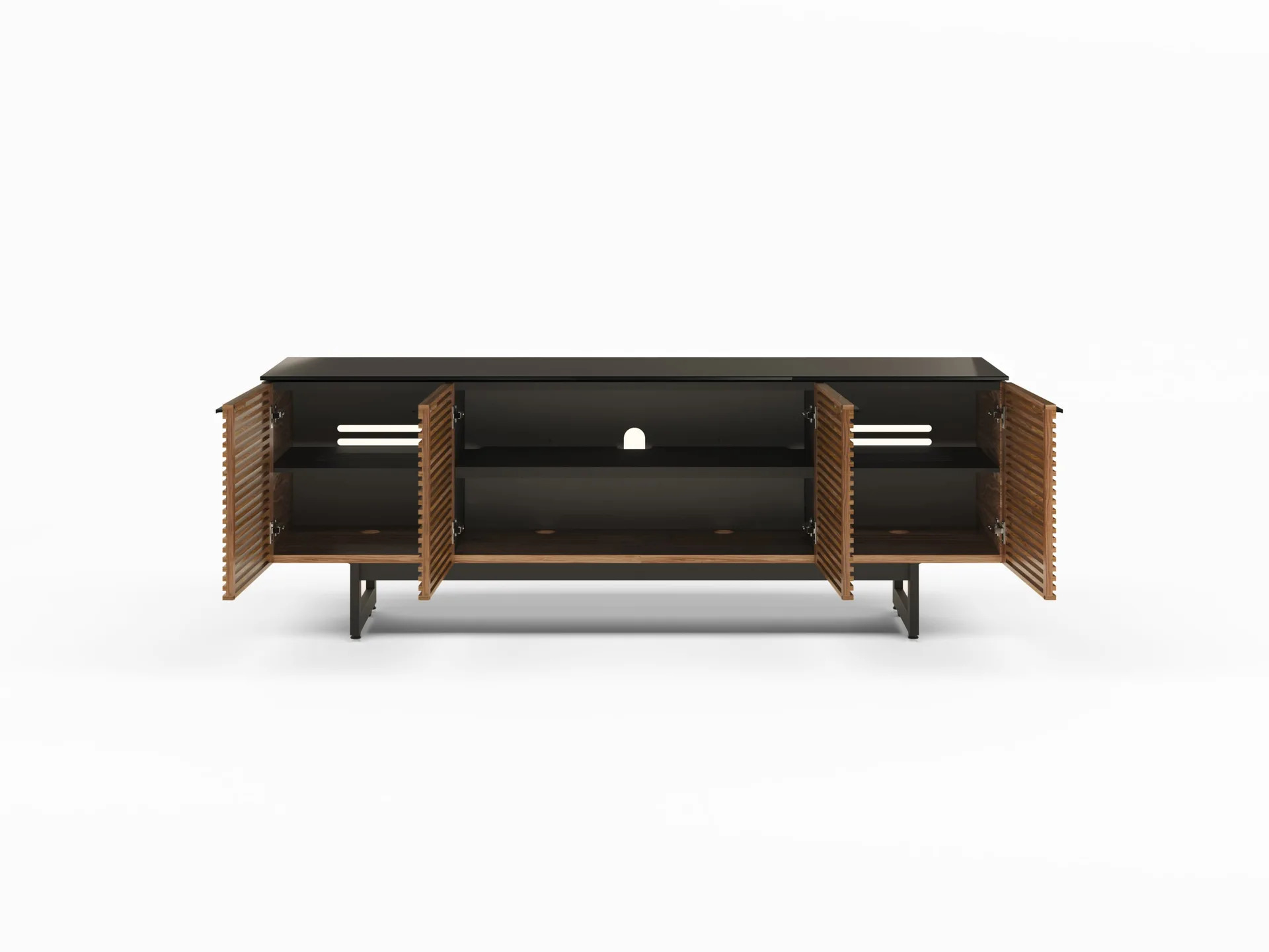 Designed with the home theater in mind—yet beautifully crafted furniture in its own right—the award-winning Corridor collection is the star of any living space. Louvered hardwood doors conceal a host of user-friendly features, sharply contrasted with a satin-etched glass top and black steel base.