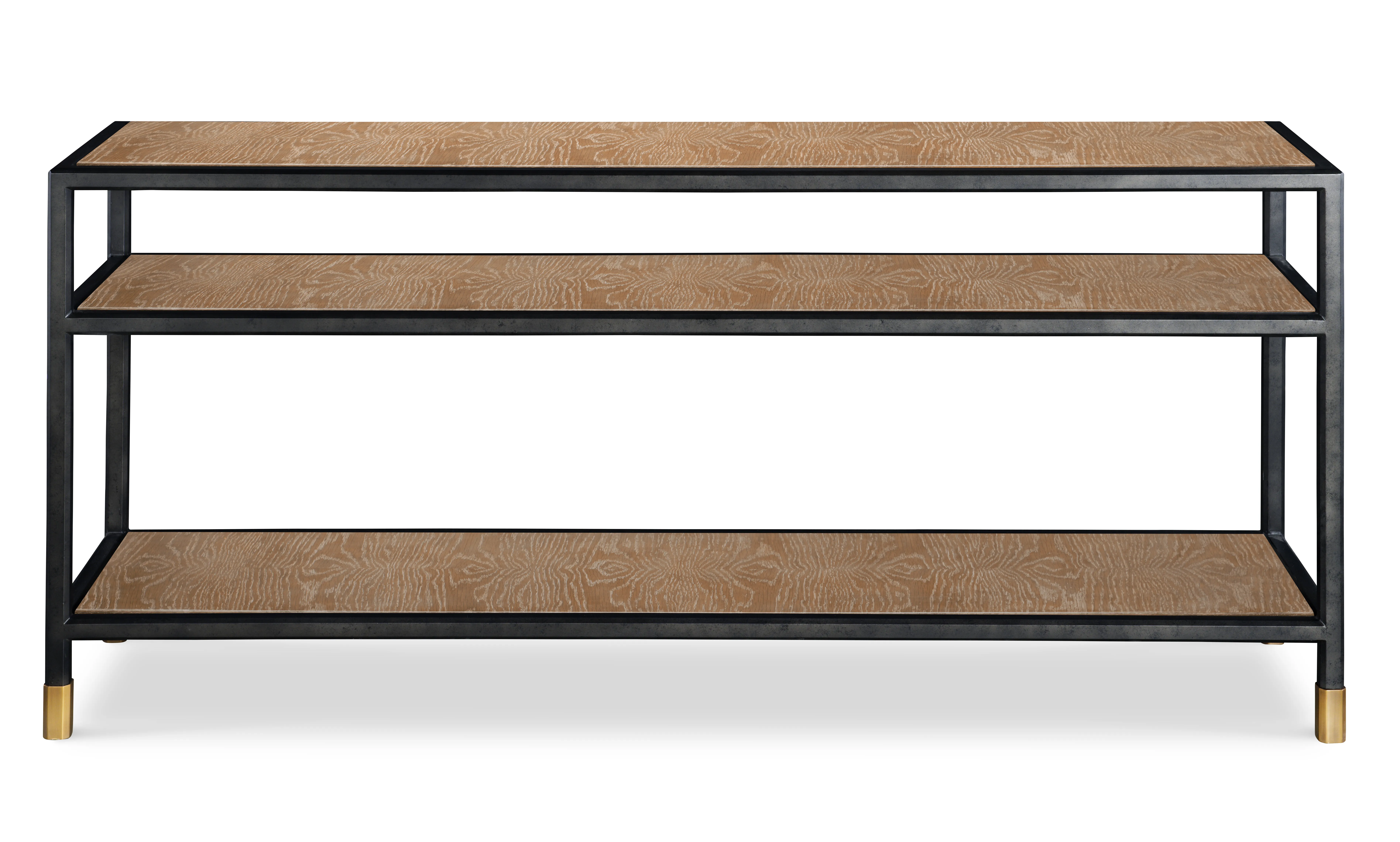 The new Jennings Table and Console Collection has grown out of the hexagon faceted Danish modern iron frame on my daybed. That base with its elegant brass foot seemed so perfect to make Coffee, Side and Console Tables with a great selection of glass, oak and walnut tops and shelves. As always for the wood veneers, each panel is carefully sized and matched. -Thomas O'Brien