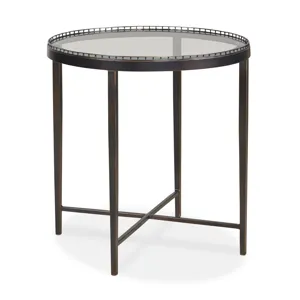 The Andrews Chairside table is crafted in Oak solids and Oak Burl Veneer in a highly distressed and aged natural finish. This oval table features a wood gallery, brass ferrules, and a removable tray top that rests above two fixed shelves. The oval shape makes this table perfect between a pair of chairs.