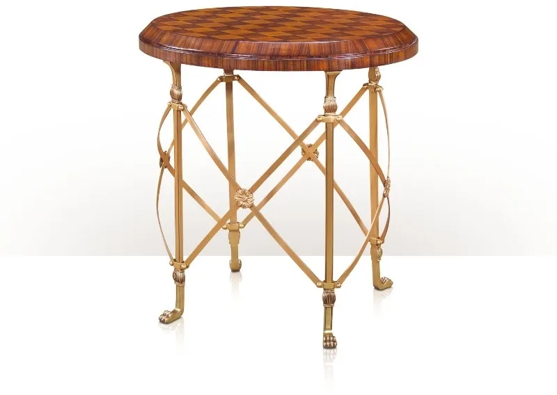 A cherry and rosewood parquetry lamp table, the oval lozenge patterned top above brass legs joined by x supports, on brass paw feet.