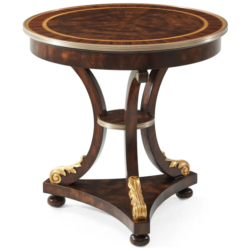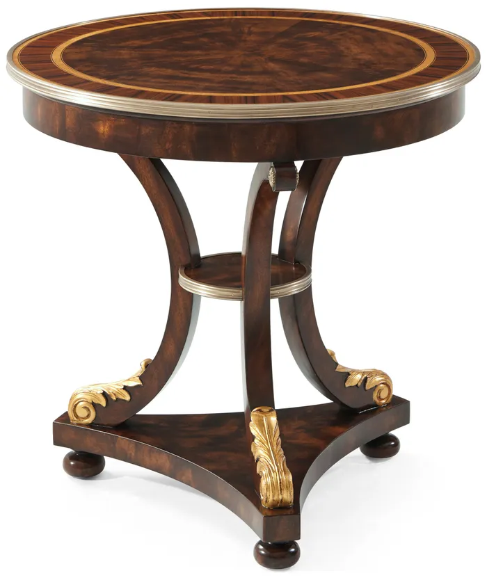A flame mahogany, Movingue and rosewood banded Gueridon table, the circular top with a brass molded edge, the plain frieze above scrolled legs joined by a brass molded stepped tier and acanthus leaf carved and gilt feet, on a trefoil concave sides base with turned mahogany bun feet. W 26 x D 26 x H 26in