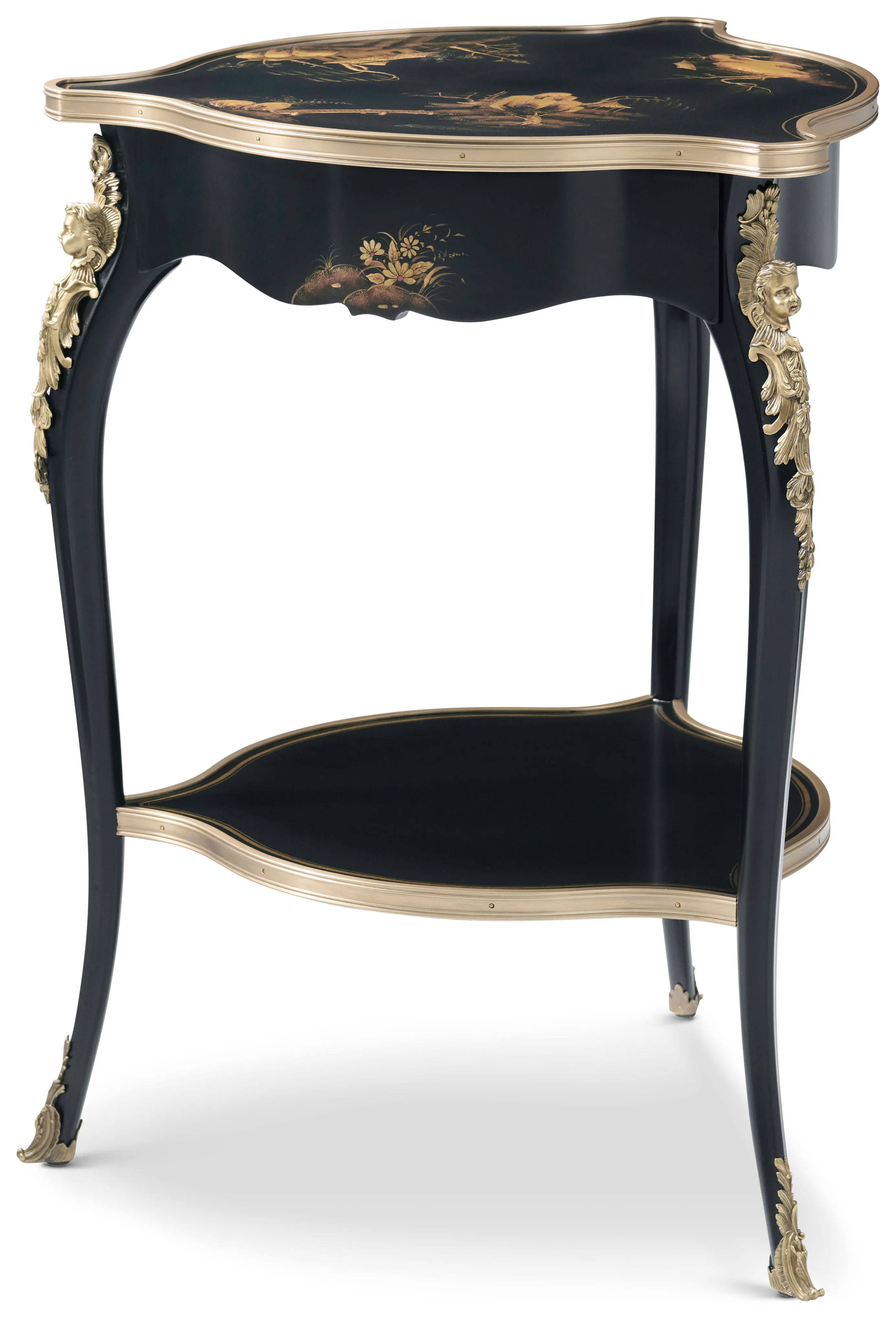With a uniquely shaped chinoiserie-adorned tabletop and lower shelf rimmed in gold-tone steel, the Lotus Lamp Table brings a peaceful elegance to the spaces which it inhabits. Lotus features additional chinoiserie paintings on the tabletop's sides, intricate steel-cast Indochine accent hardware, and curved legs. Part of the deftly crafted Brushwork collection, this piece showcases the true mastery and skill-driven techniques of Theodore Alexander's master artisans.
