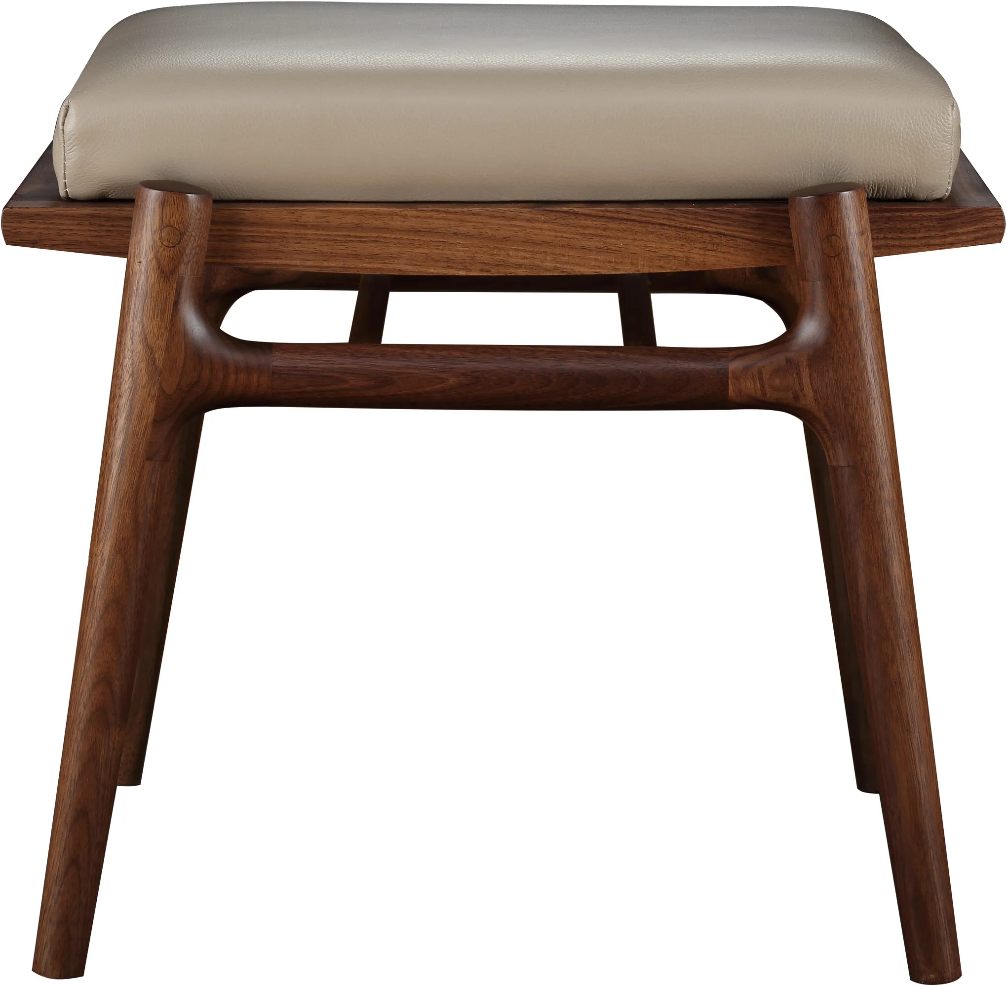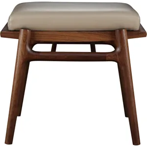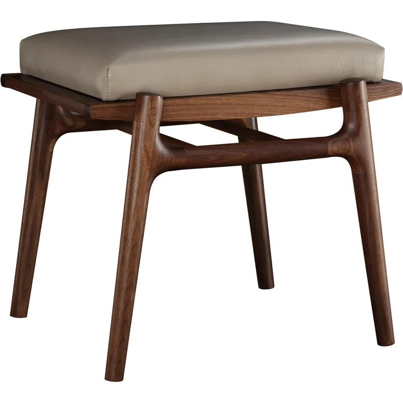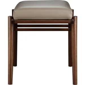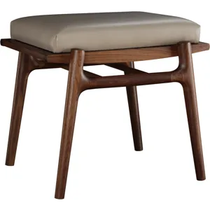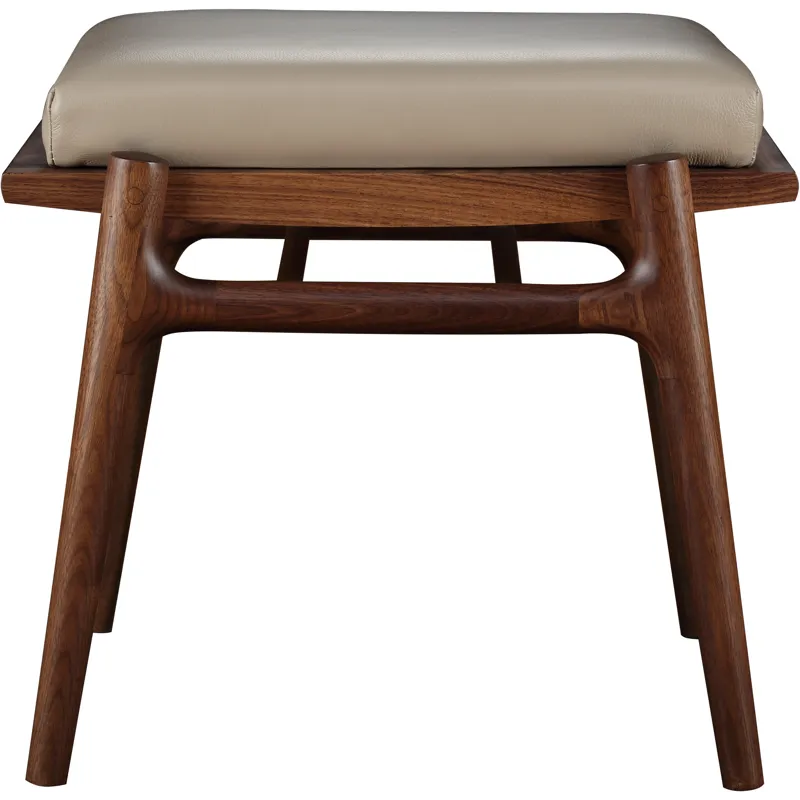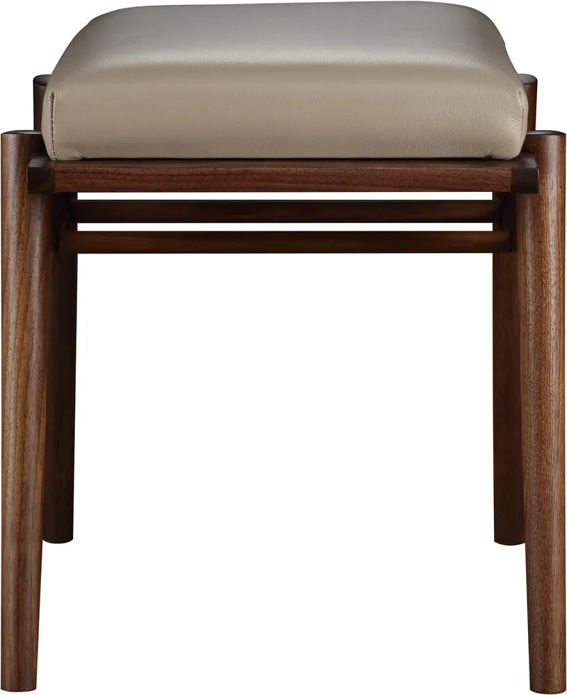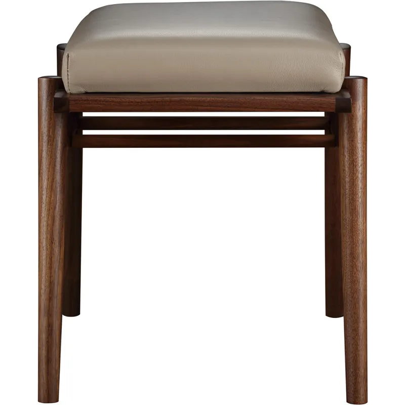 The Walnut Grove Footstool nestles delicately beneath the Cocktail Table or holds its own as an accent piece. It features four gracefully tapered legs in mid-century modern style connected to a shaped wooden frame, and the tightly upholstered seat is available in fabric or leather.
