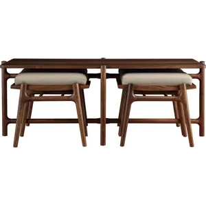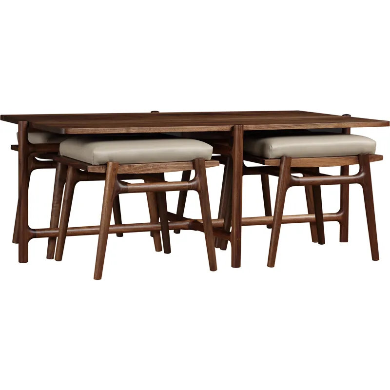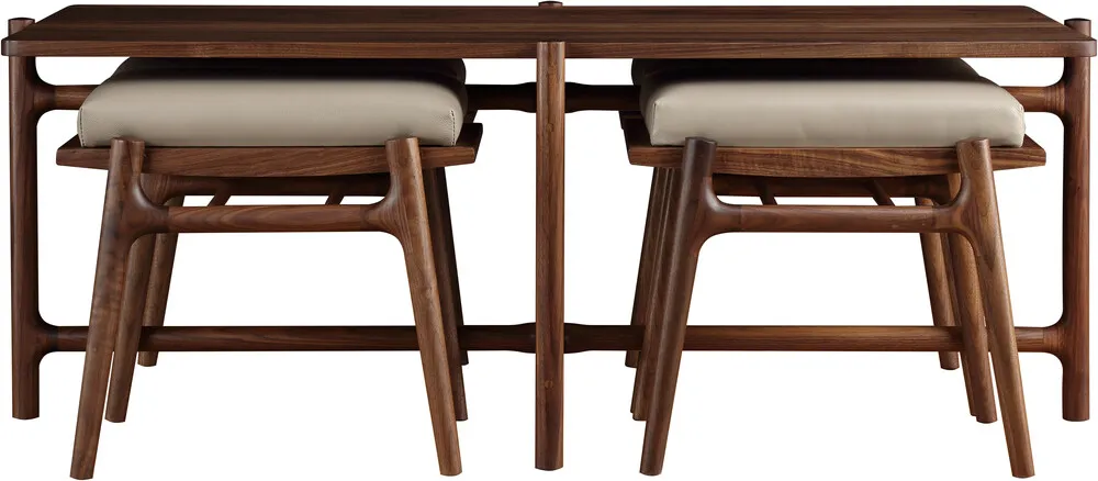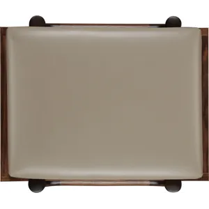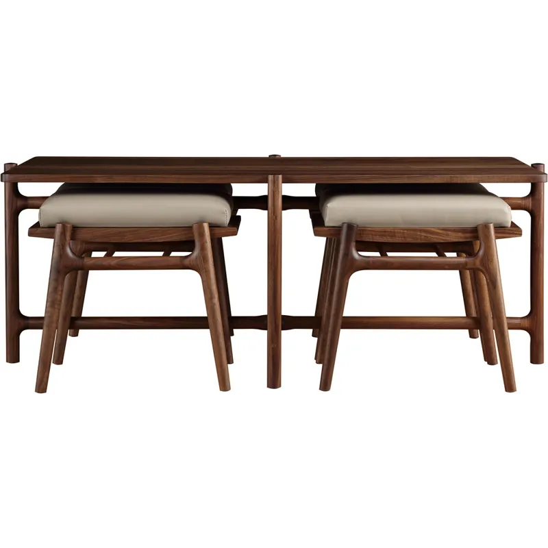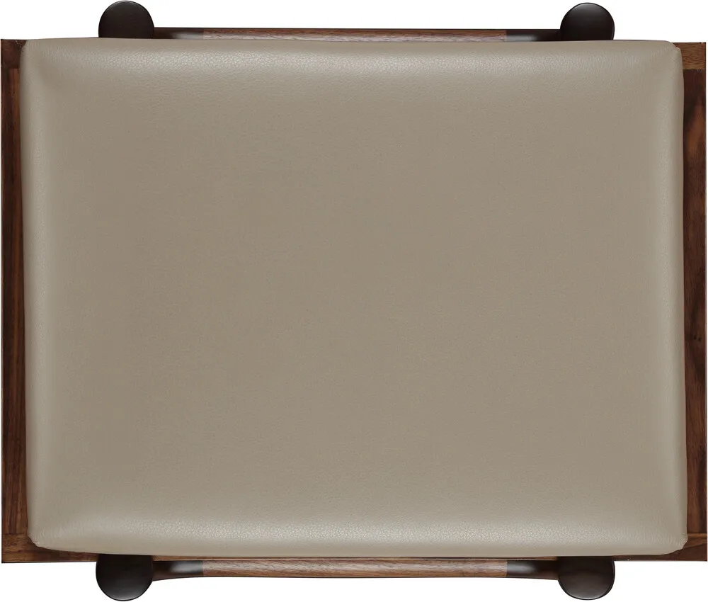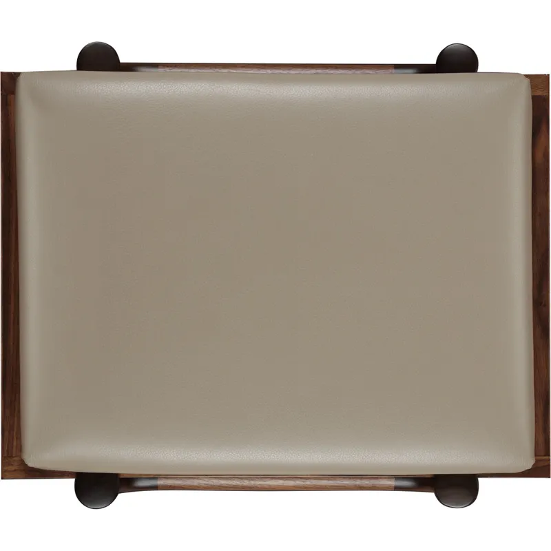 The Walnut Grove Footstool nestles delicately beneath the Cocktail Table or holds its own as an accent piece. It features four gracefully tapered legs in mid-century modern style connected to a shaped wooden frame, and the tightly upholstered seat is available in fabric or leather.