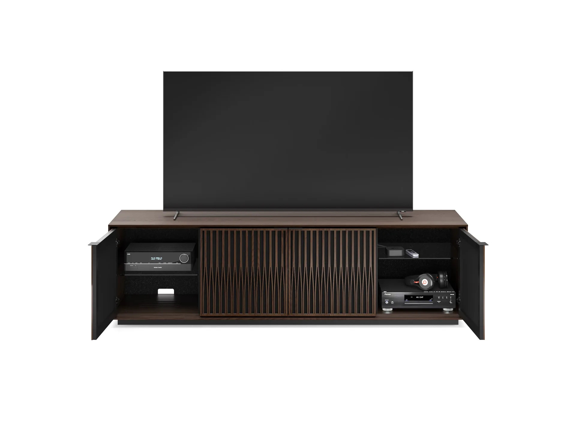 Precisely crafted doors with perforated metal backing offer ventilation and IR-remote compatibility, keeping your media components accessible and ventilated with sleek, understated elegance.